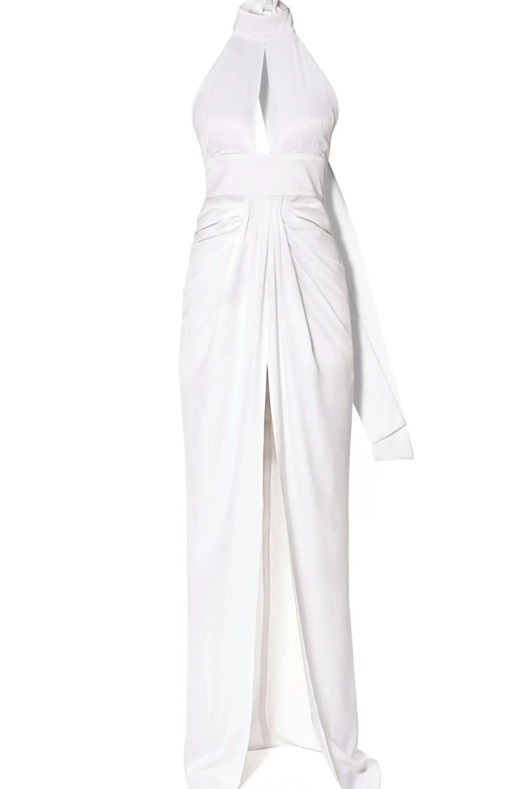 Suknia Maxi O Posagowej Linii Wykonana Z Miesistego, Szlachetnego Atlasu. Mocny Akcent Skierowany Na Podkreslenie Talii. Zmyslowo Odsloniete Ramiona I Plecy. Gleboki A Zarazem Subtelny Dekolt Z Bardzo Dluga Szarfa Wiazana Wokol Szyi. Ponizej Talii Promieniste Drapowania Podkreslajace Ksztalt Kobiecych Bioder Oraz Jednoczesnie Wysmuklajace Sylwetke Miekko Opadajac W Dol Nadajac Posagowego Charakteru Projektowi. Wysokie Rozciecie Przy Ruchu Sensualnie Odslania Nogi.