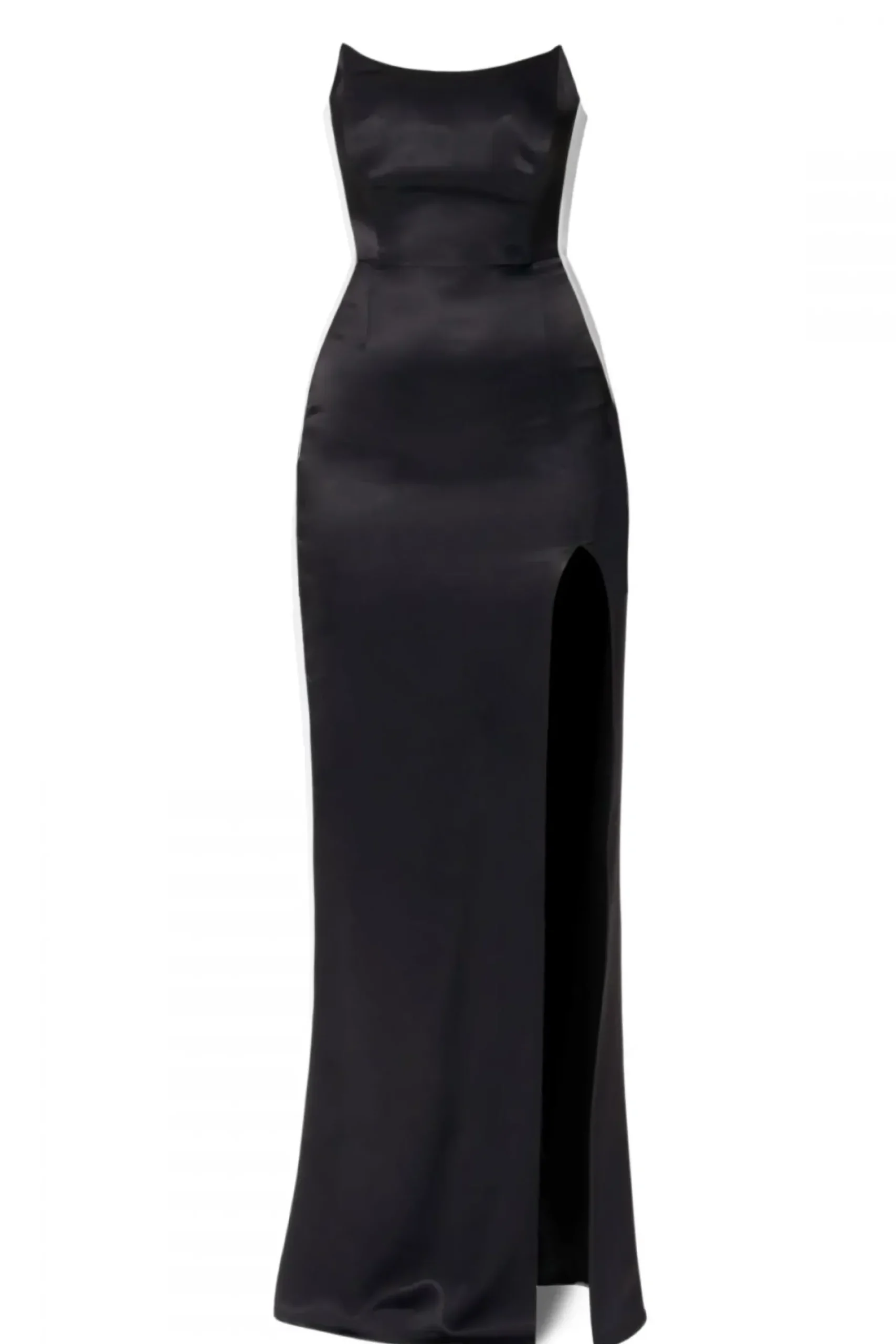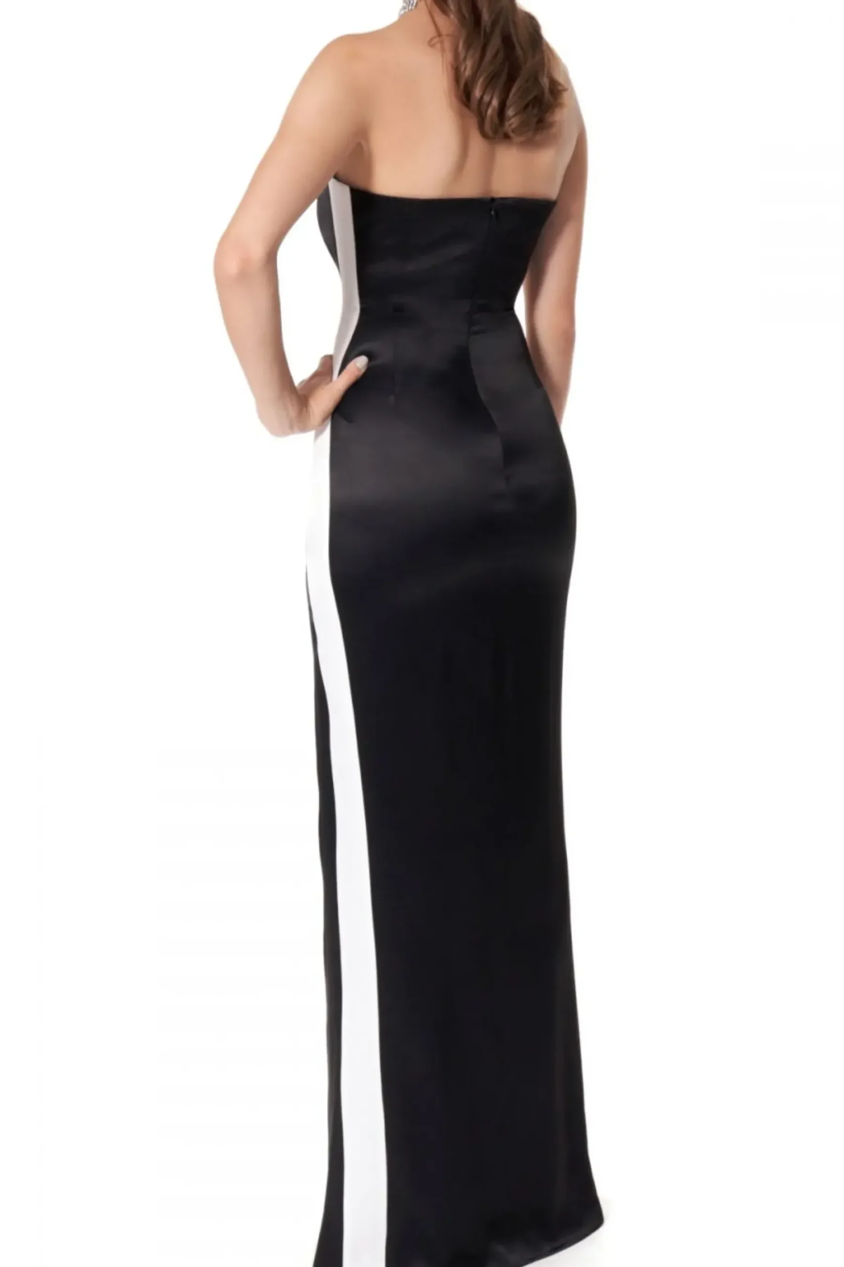 Wieczorowa Czarno- Biala Suknia Maxi Z Rozcieciem Odslaniajacym Udo. Gorset Wymodelowany Fiszbinami Perfekcyjnie Podkresla Talie. Pionowe Kontrastujace Lampasy Spektakularnie Wydluzaja I Wysmuklaja Sylwetke. Projekt Zostal Uszyty Z Miesistego Lejacego Atlasu.