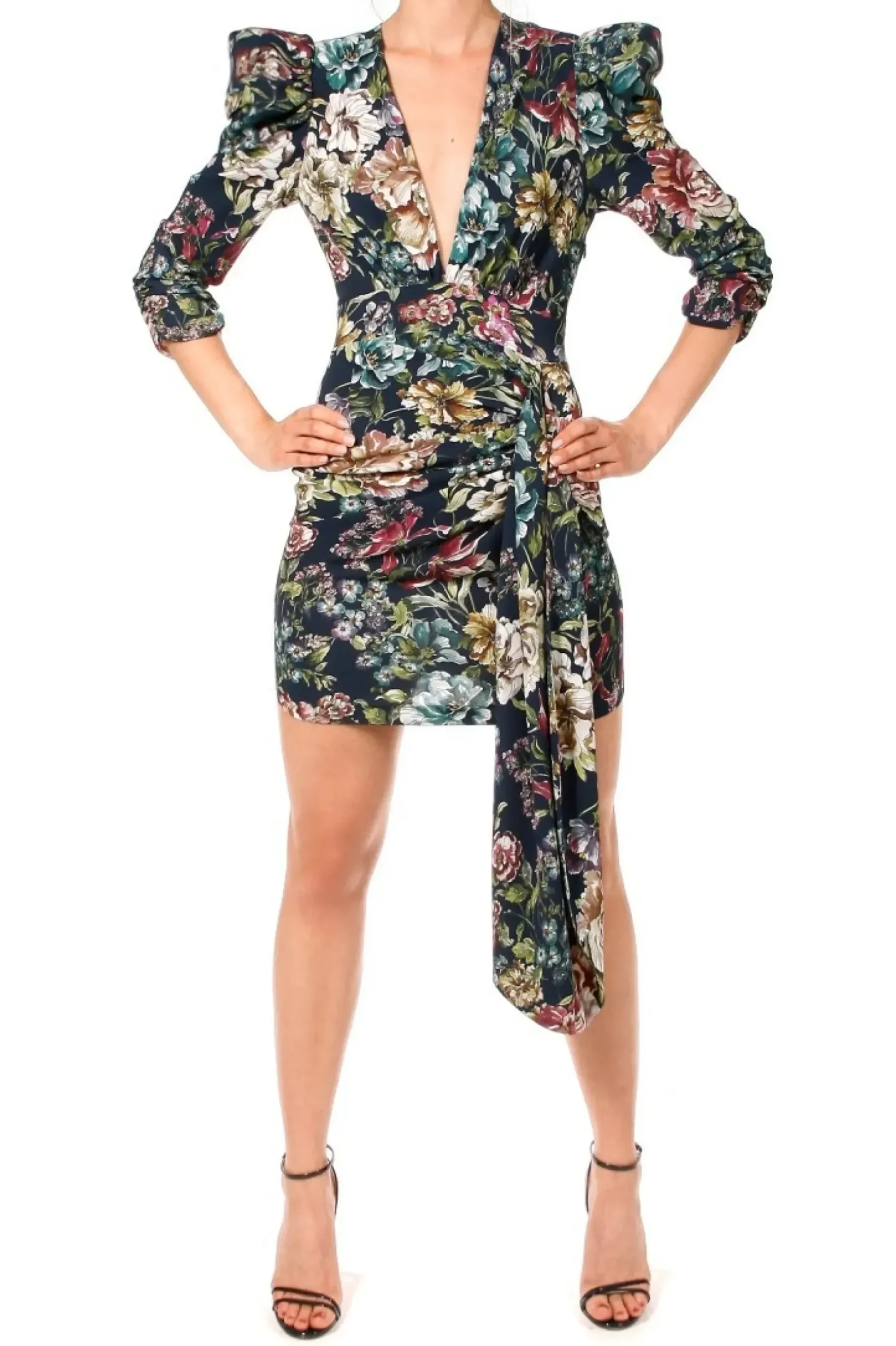 Sukienka Mini W Desen Kwiatowy Inspirowany Francuskim Impresjonizmem. Odwazny Dekolt, Bufiaste Drapowane Rekawy Z Wszyta Poduszka Nawiazuja Do Stylu Lat 80-Tych. Dol Sukienki Drapowany Na Przodzie I Ozdobiony Fantazyjnie Ukladajacym Sie Elementem. Sukienka Zapinana Jest Z Boku Na Kryty Zamek.