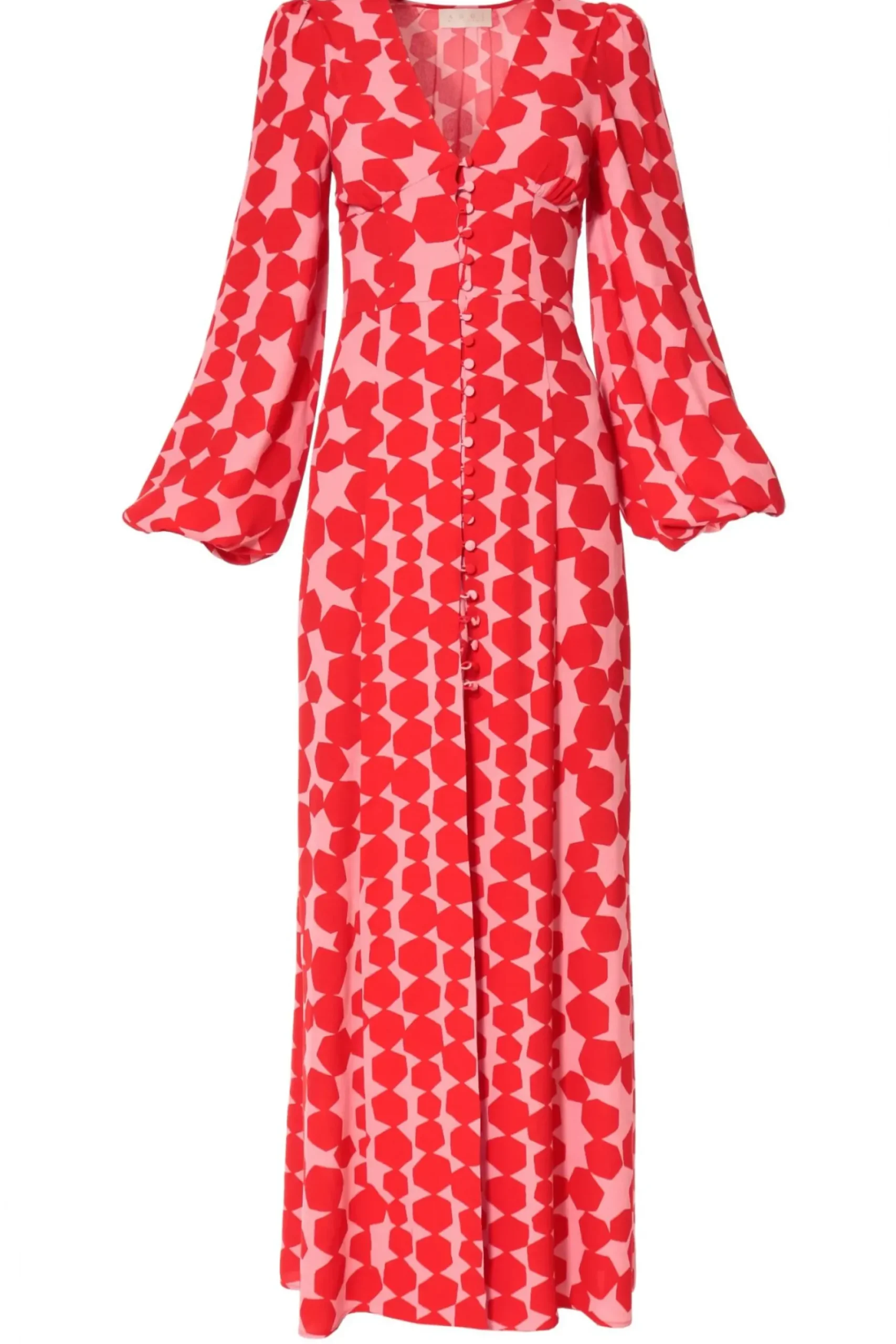Suknia Maxi Uszyta Z Krepy Wiskozowej W Nowoczesny Desen Laczacy Odcien Rozu Z Makowa, Zywa Czerwienia.