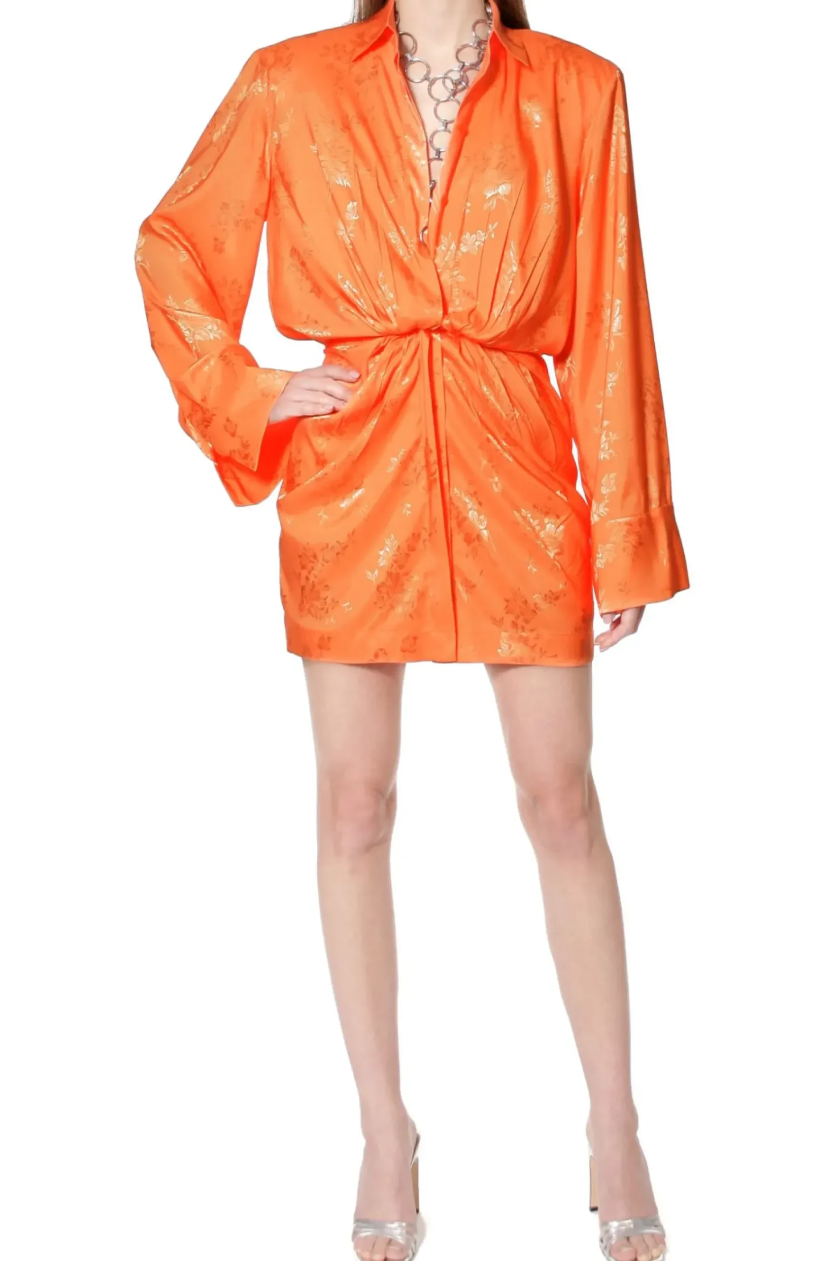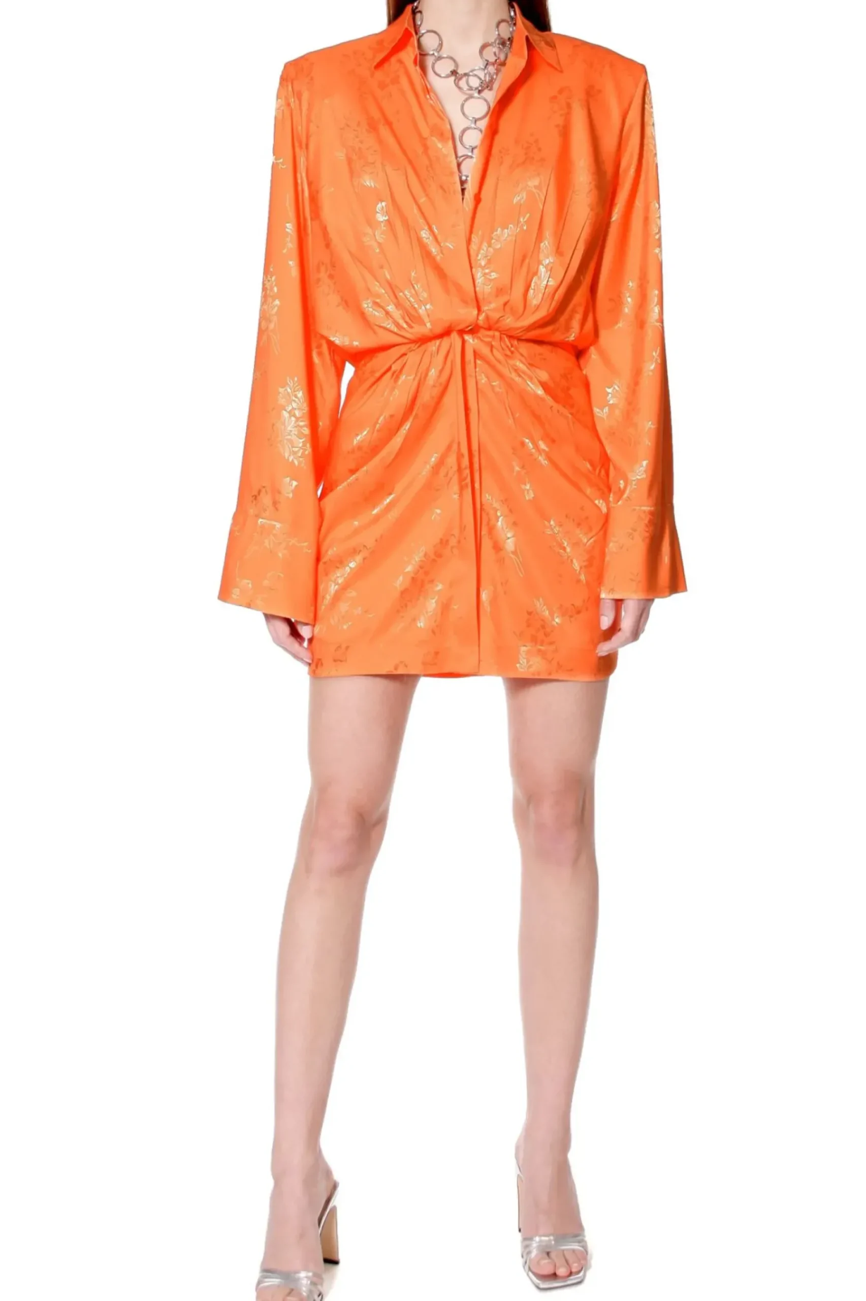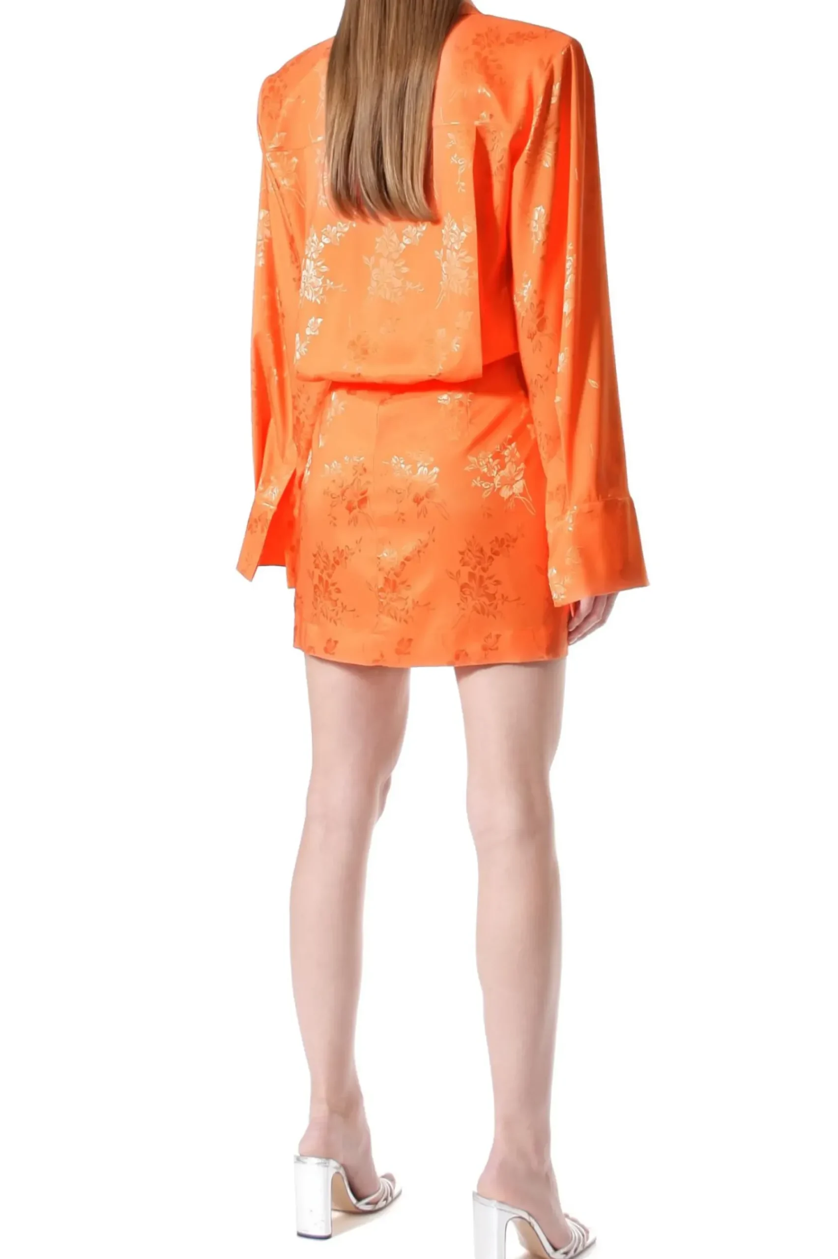Sukienka Mini O Kroju Koszulowym Z Mocno Zaakcentowana Linia Ramion Uszyta Z Zakardowej Satyny W Drobny Kwiatowy Desen. Oversizowy Koszulowy Kroj Przelamany Promieniscie Ukladajacymi Sie Misternymi Zakladkami Kontrastuje Z Krotkim Dopasowanym Dolem. Przeskalowane Rekawy O Dlugosci Maxi Wykonczone Szerokimi Mankietami. Czesciowo Na Zorzetowej Podszewce.