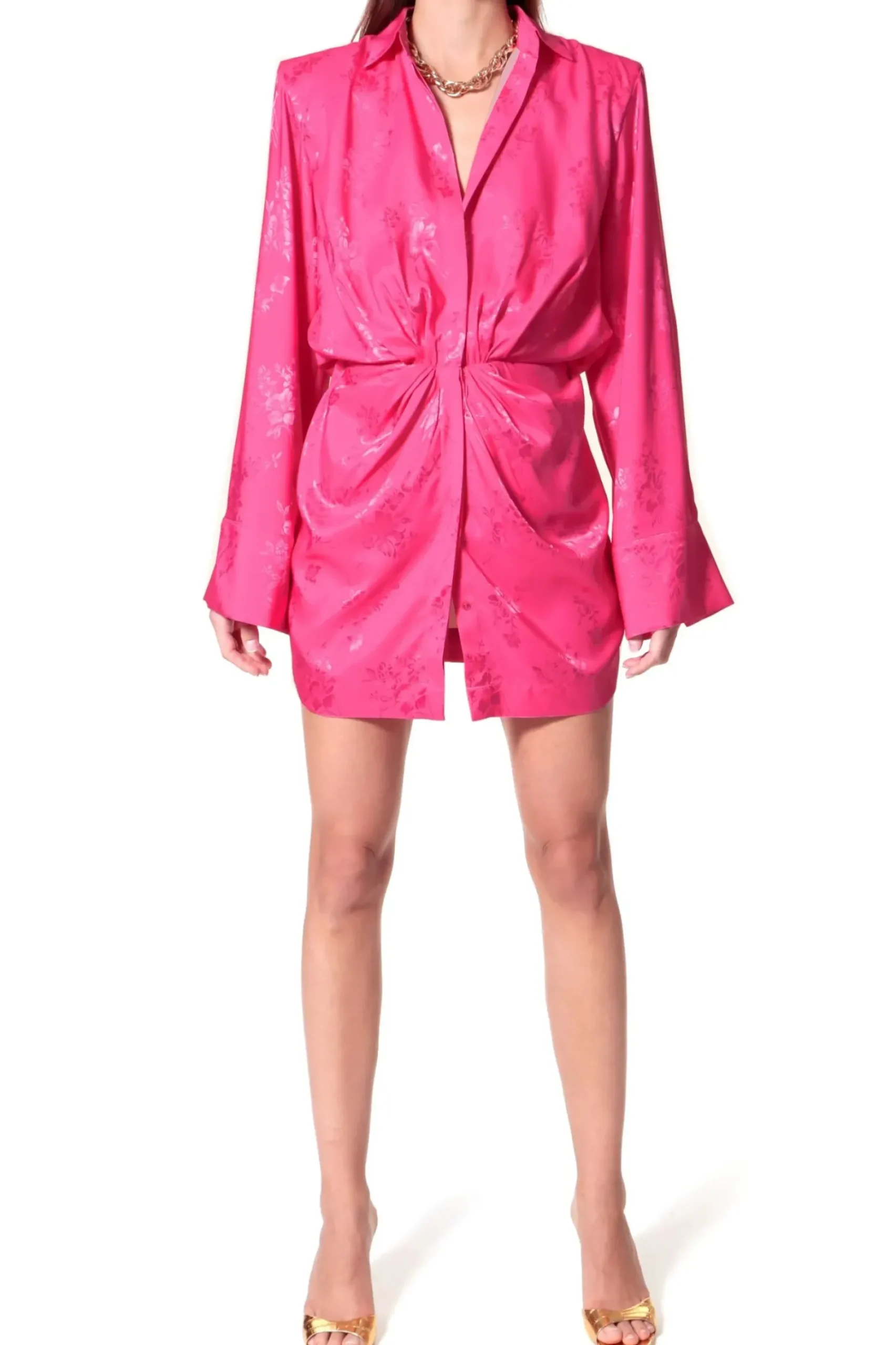 Sukienka Mini O Kroju Koszulowym Z Mocno Zaakcentowana Linia Ramion Uszyta Z Zakardowej Satyny W Drobny Kwiatowy Desen. Oversizowy Koszulowy Kroj Przelamany Promieniscie Ukladajacymi Sie Misternymi Zakladkami Kontrastuje Z Krotkim Dopasowanym Dolem. Przeskalowane Rekawy O Dlugosci Maxi Wykonczone Szerokimi Mankietami. Czesciowo Na Zorzetowej Podszewce.