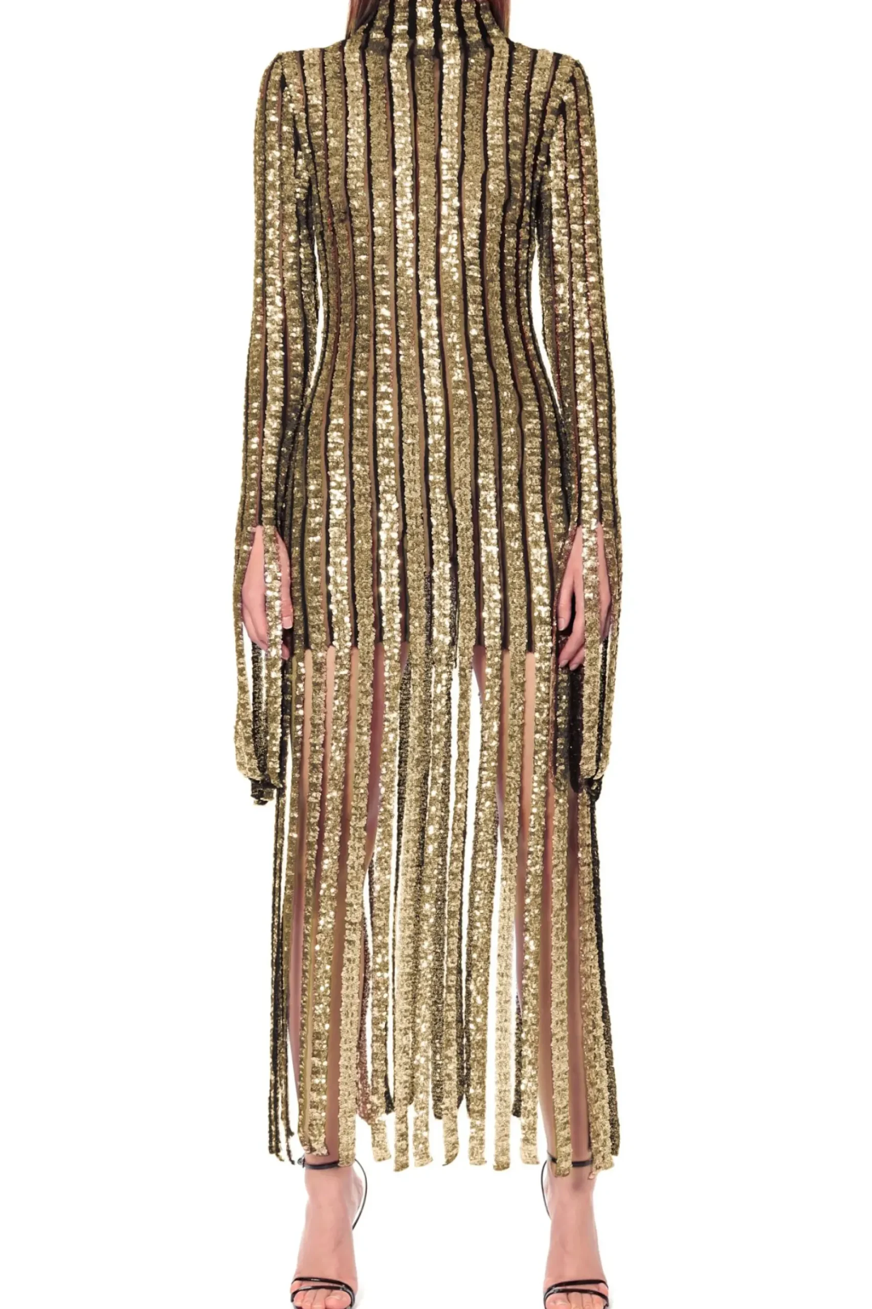 Dluga Suknia Z Fredzlami Wyszywana Zlotymi Cekinami.