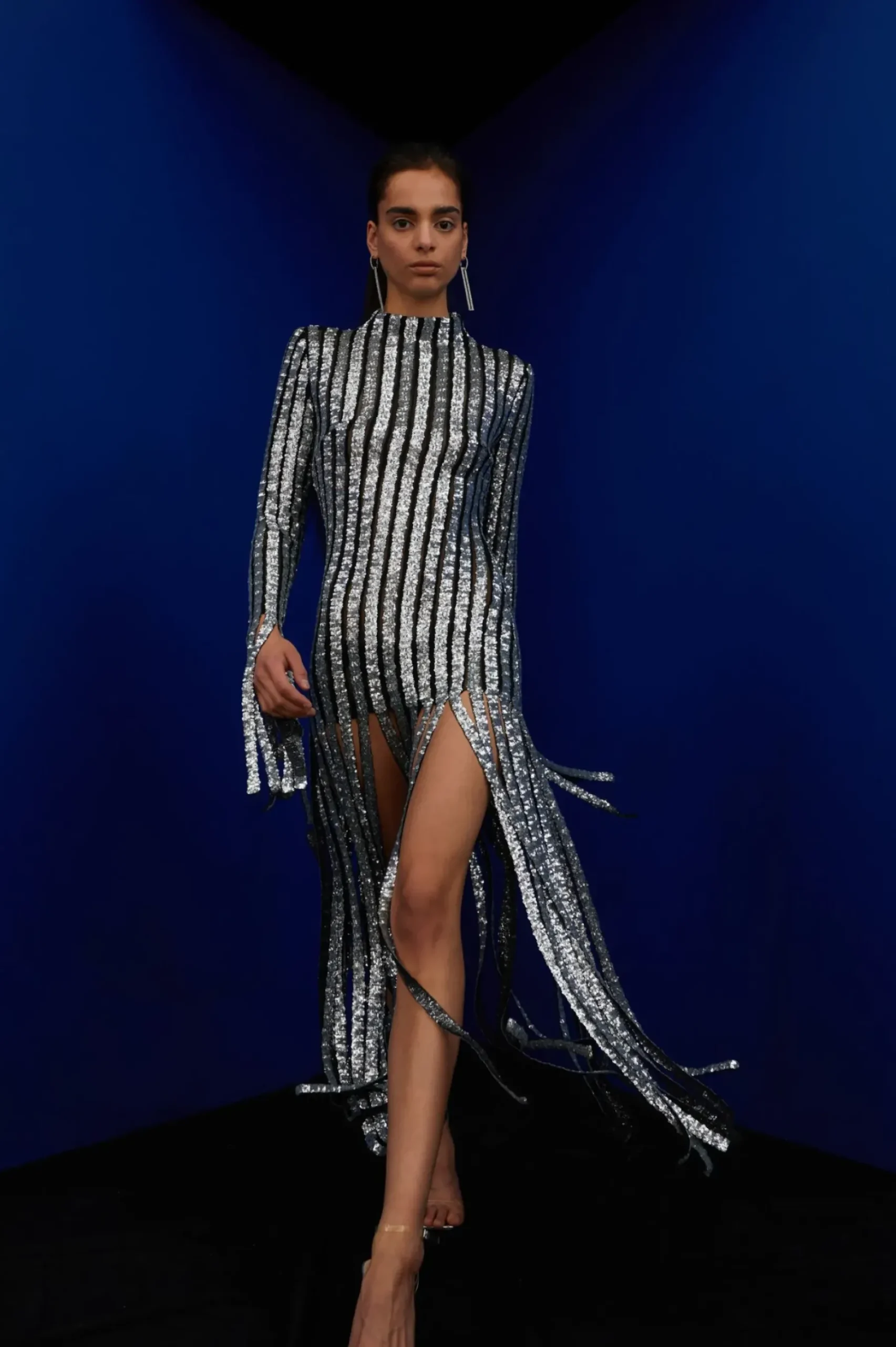 Dlugie, „Tanczace” Wraz Z Ruchem Ciala Cekinowe Fredzle Odkrywaja Zmyslowo Nogi I Uda.