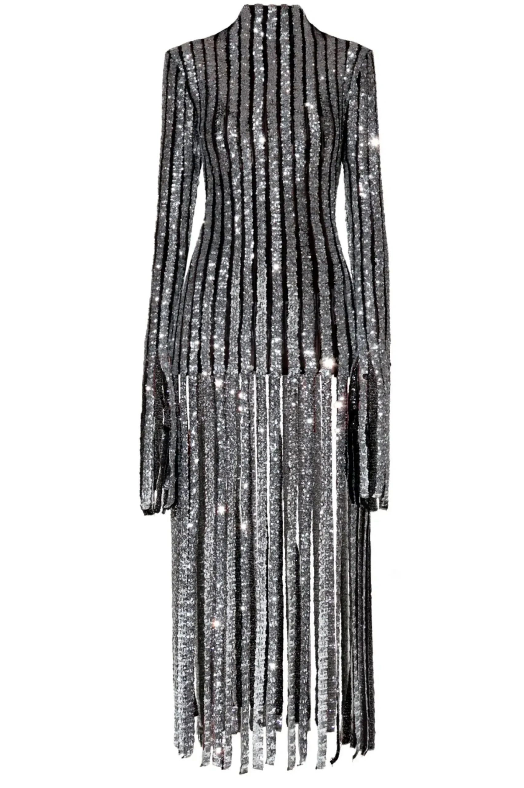 Dluga Suknia Z Fredzlami Wyszywana Srebrnymi Cekinami.