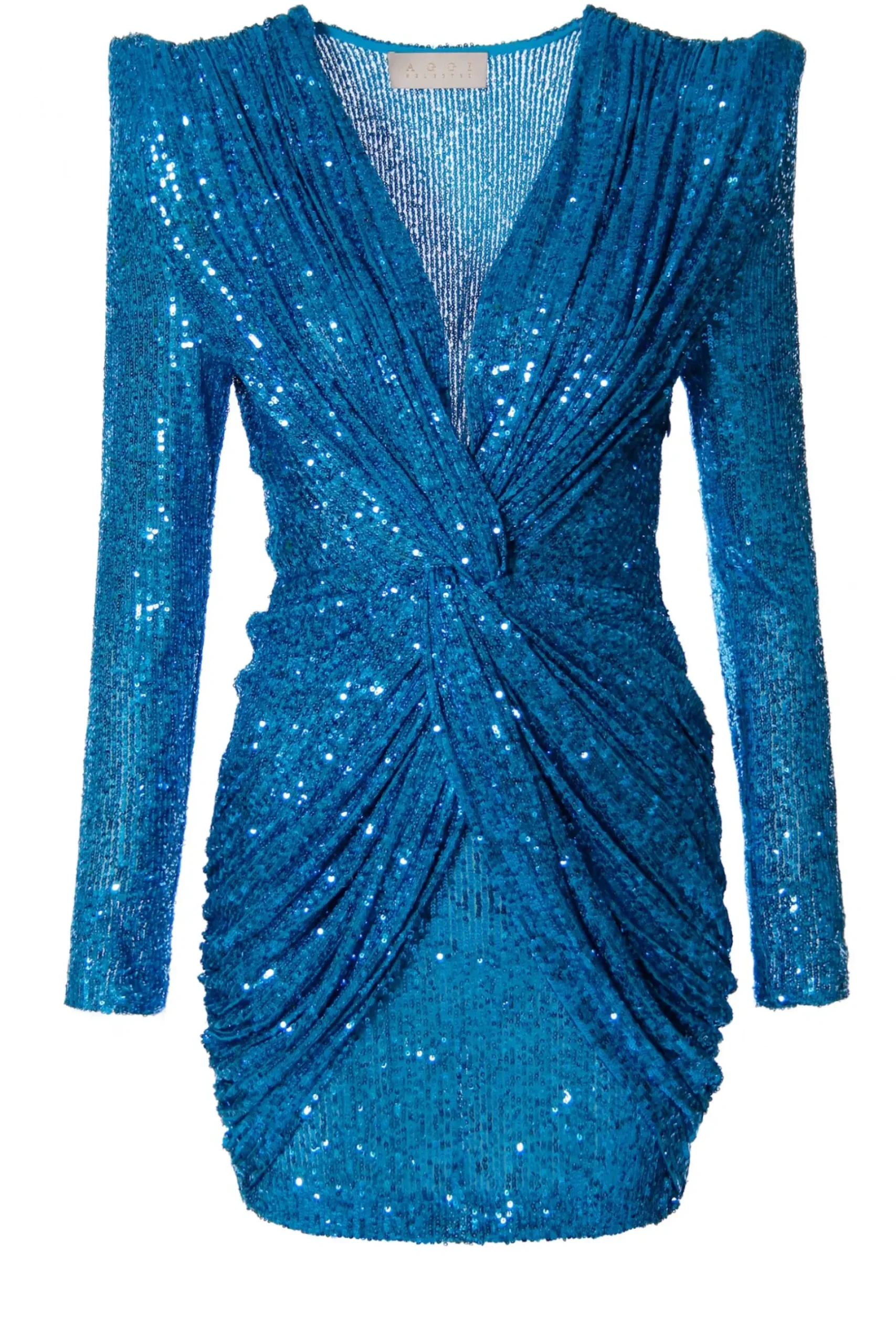 Wieczorowo-Koktajlowa Sukienka Mini Wyszywana Polyskujacymi, Drobnymi Cekinami W Intensywnym Kolorze. Mocno Zarysowana, Futurystyczna Linia Ramion, Gleboki Dekolt, Bogate Drapowania I Efektowny Supel W Talii Skladaja Sie Na Spektakularny Charakter Projektu. Sukienka Cekinowa Na Wieczorne Wyjscie, Noc Sylwestrowa, Wesele.