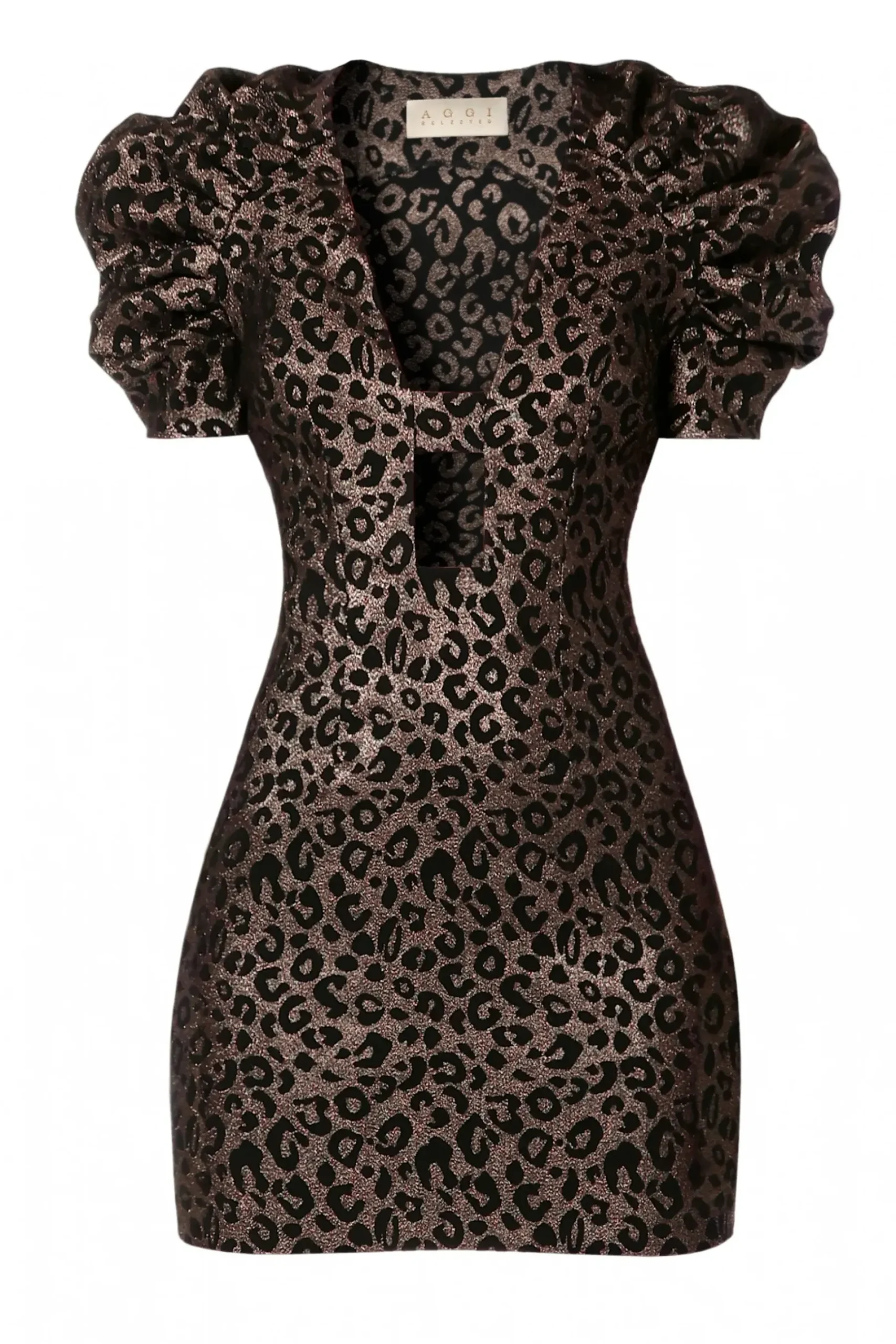 Przyciagajaca Wzrok Sukienka Mini Wykonana Z Materialu Bogato Wyszywanego Wzorem W Zlota Panterke. Idealnie Dopasowana Dzieki Pieknie Skrojonym Zaszywkom, Z Bardzo Ciekawym Dekoltem. Wyjatkowosc Sukienki Podkreslaja Bufiaste Rekawki Misternie Uszyte Tak By Tworzyc Pofalowana Calosc. Sukienka Jest Zapinana Z Tylu Na Zamek. Cudowna Kreacja Na Sylwestra Lub Zabawe Karnawalowa.