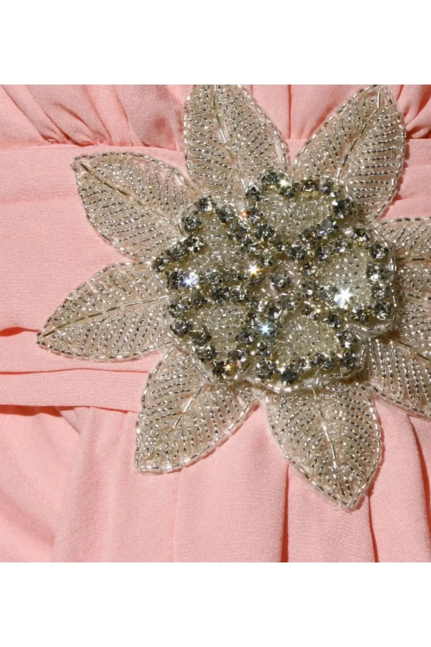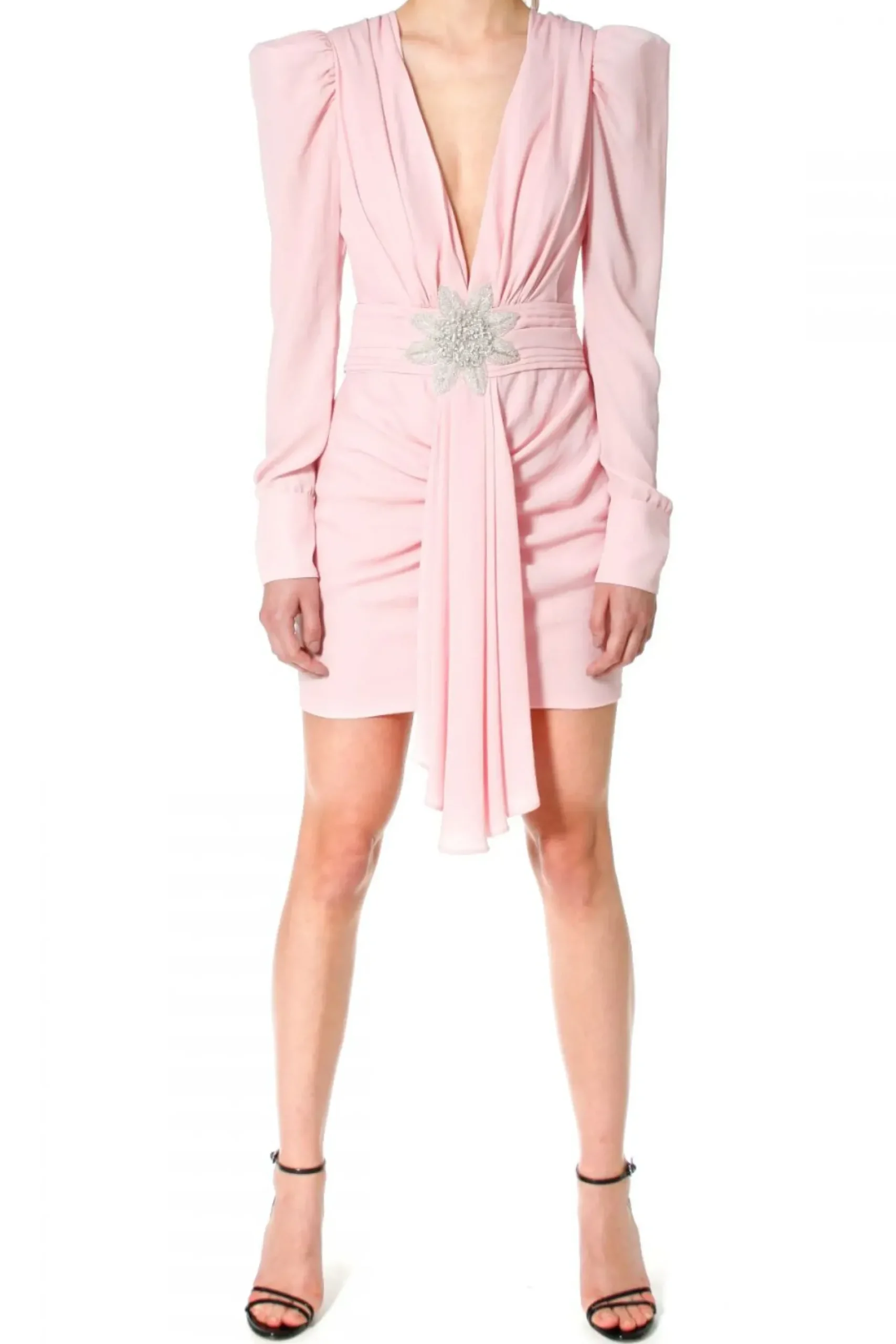 Sukienka Mini Uszyta Z Krepy Szyfonowej. Gleboki, Zdecydowany Dekolt. W Talii Wszyty Szeroki, Mocno Drapowany Pas Ozdobiony Duza Aplikacja Misternie Wykonana Ze Szklanych Koralikow. Dlugie, Bufiaste Rekawy Zakonczone Szerokim Mankietem Zapinanym Na Malutkie Oblekane Guziki Z Petelka. Dol Sukienki Dopasowany, Z Marszczeniami Na Przodzie I Ozdobnym Dluzszym Od Sukienki Elementem. Z Boku Wszyty Zamek Blyskawiczny Dobierz Do Niej Sandaly Na Wysokiej Szpilce Lub Wieczorowe Ozdobne Klapki.