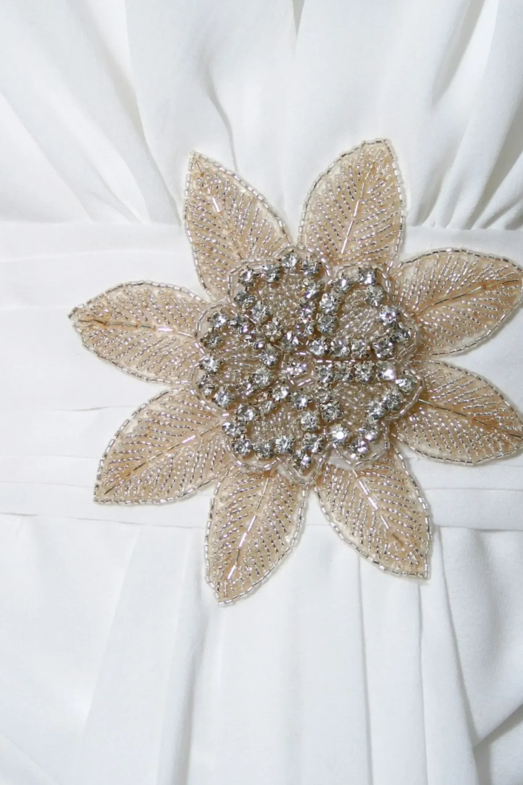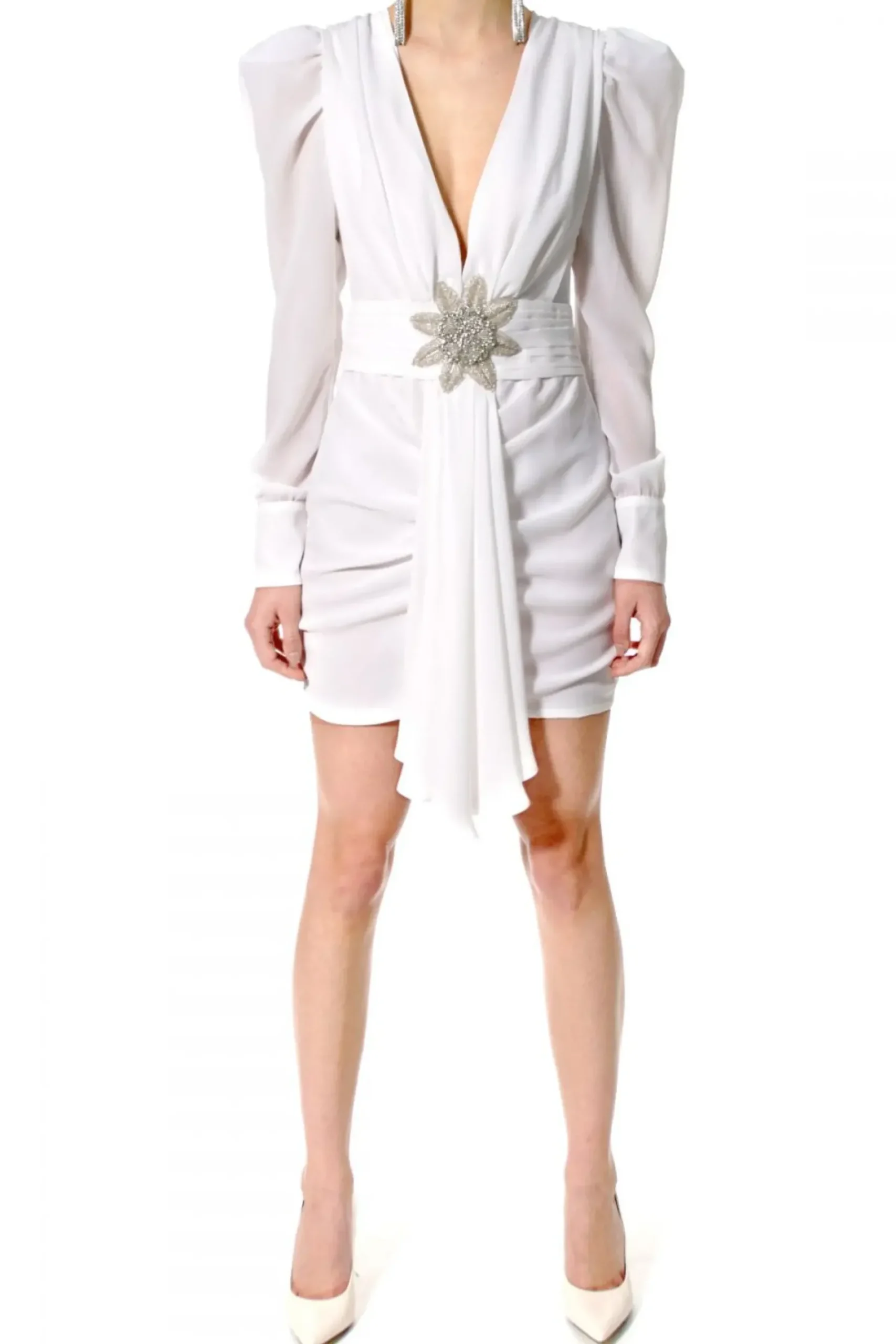 Sukienka Mini Uszyta Z Krepy Szyfonowej. Gleboki, Zdecydowany Dekolt. W Talii Wszyty Szeroki, Mocno Drapowany Pas Ozdobiony Duza Aplikacja Misternie Wykonana Ze Szklanych Koralikow. Dlugie, Bufiaste Rekawy Zakonczone Szerokim Mankietem Zapinanym Na Malutkie Oblekane Guziki Z Petelka. Dol Sukienki Dopasowany, Z Marszczeniami Na Przodzie I Ozdobnym Dluzszym Od Sukienki Elementem. Z Boku Wszyty Zamek Blyskawiczny Dobierz Do Niej Sandaly Na Wysokiej Szpilce Lub Wieczorowe Ozdobne Klapki.
