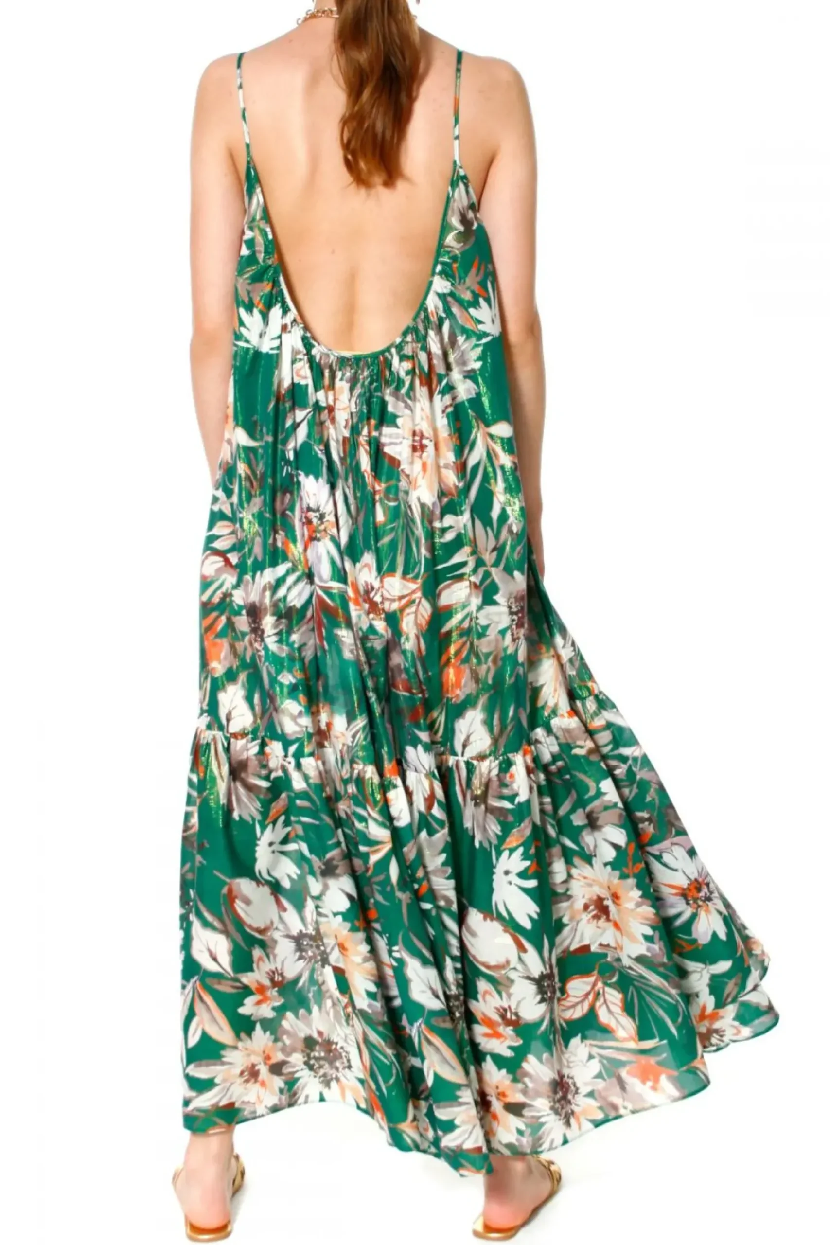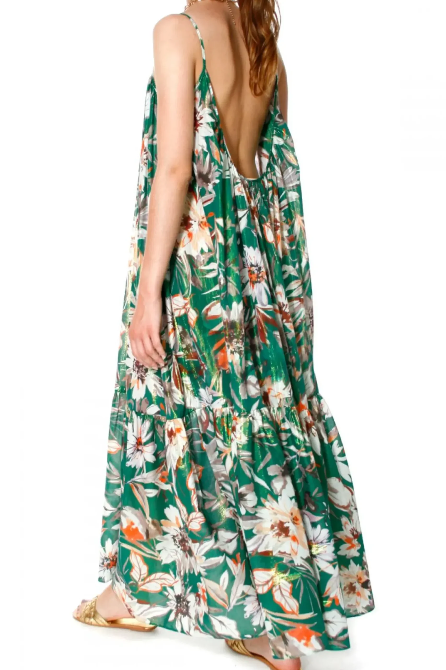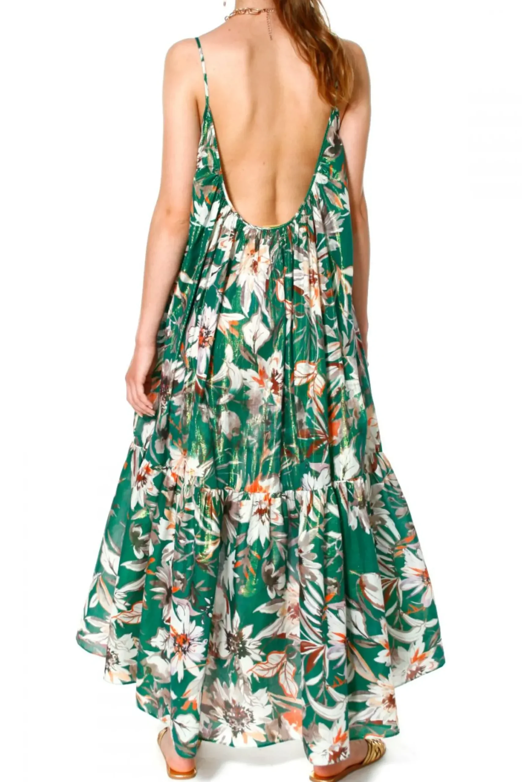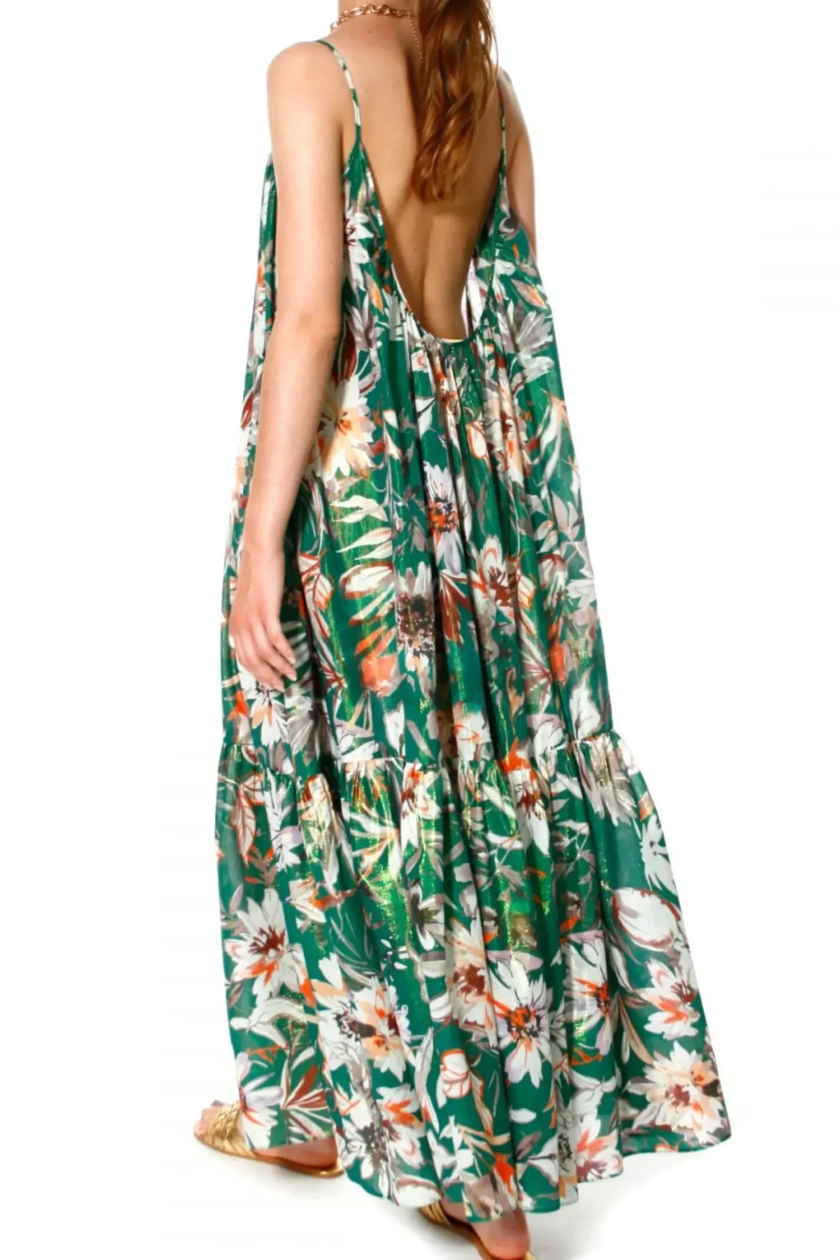 Suknia Maxi W Stylu Boho Uszyta Z Delikatnego Batystu Z Dodatkiem Miekkiej Nici Metalicznej, Ktora Gesto Wpleciona Subtelnie Odbija Swiatlo I Nadaje Tkaninie Szlachetnego Perlowo-Zlotego Polysku. Przeskalowana Przestrzenna Forma „Zawieszona” Na Cieniutkich Ramiaczkach Typu Makaroniki. Bogato Marszczona Falbana I Malarski Desen Kwiatowy Tworza Spektakularny Efekt. Obszerna, Kilkumetrowa Powierzchnia Batystu Tajemniczo Okrywa Sylwetke Pozostajac Jednoczesnie W Mocnym Kontrascie Z Gleboko I Zmyslowo Odslonietymi Plecami. W Upalne Dni Zaloz Do Niej Klapki, Zloty Lancuch I Slomkowa Fedore. W Chlodniejsze Letnie Dni Polacz Suknie Z Dzinsowa Kurtka I Sneakersami.