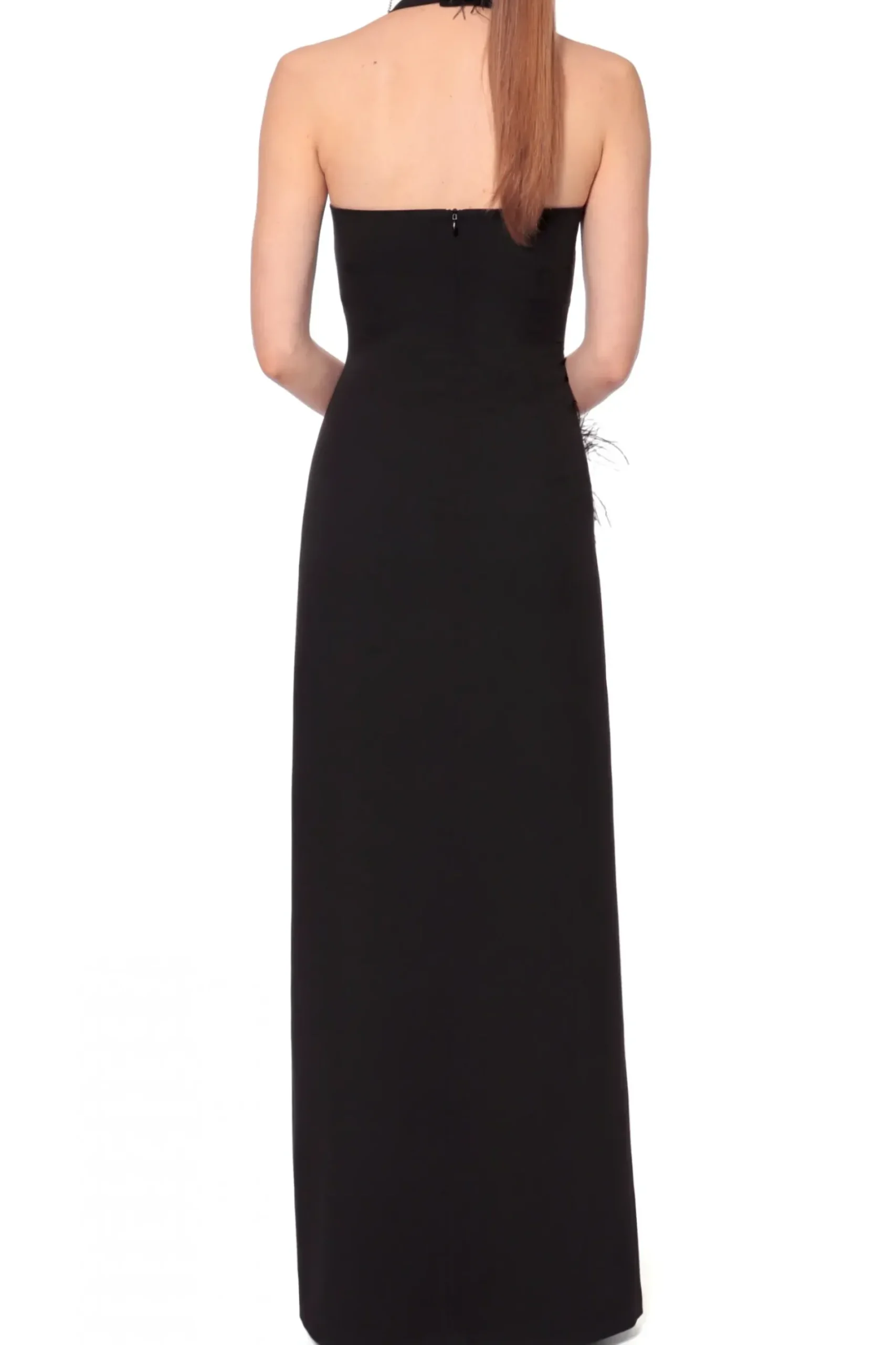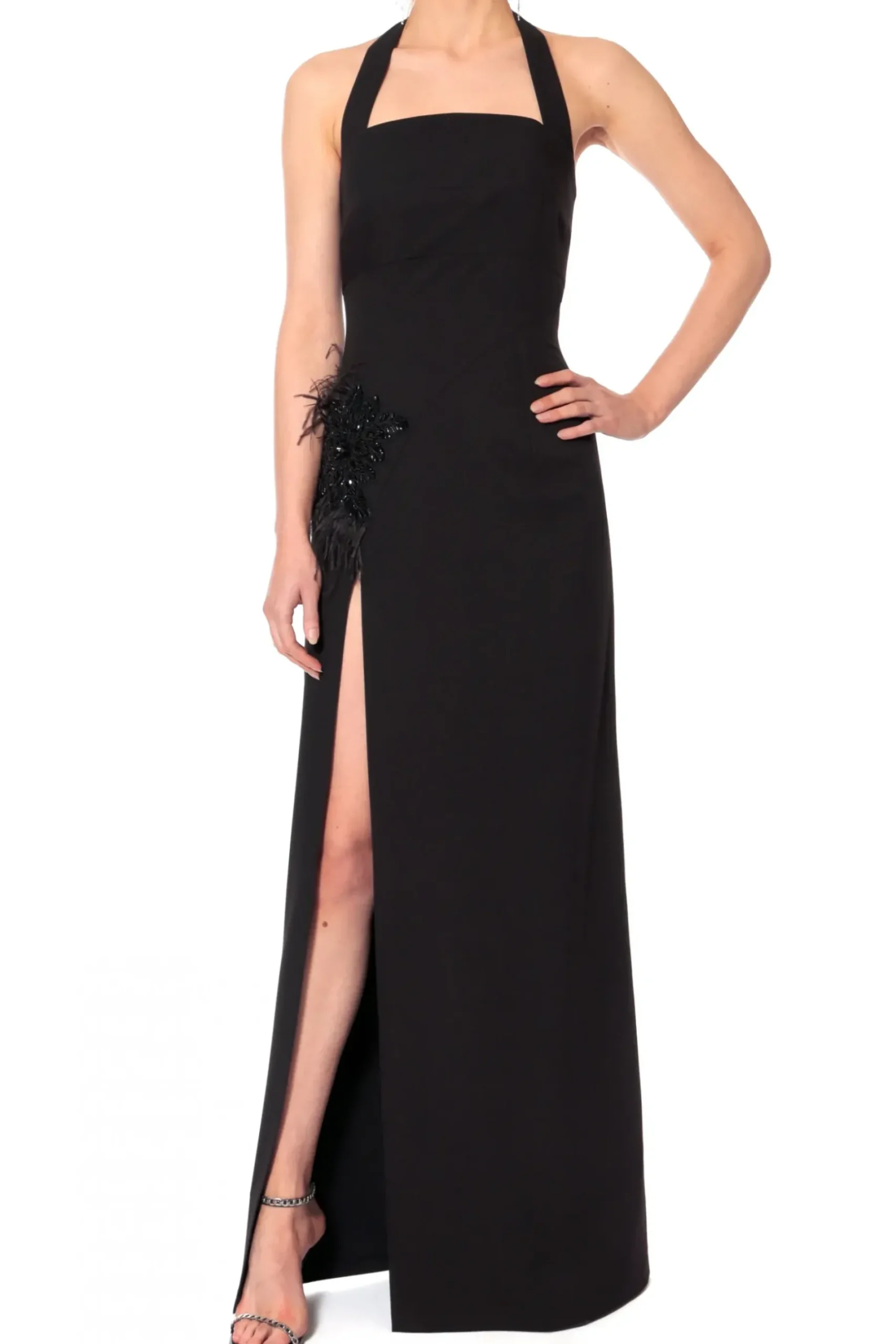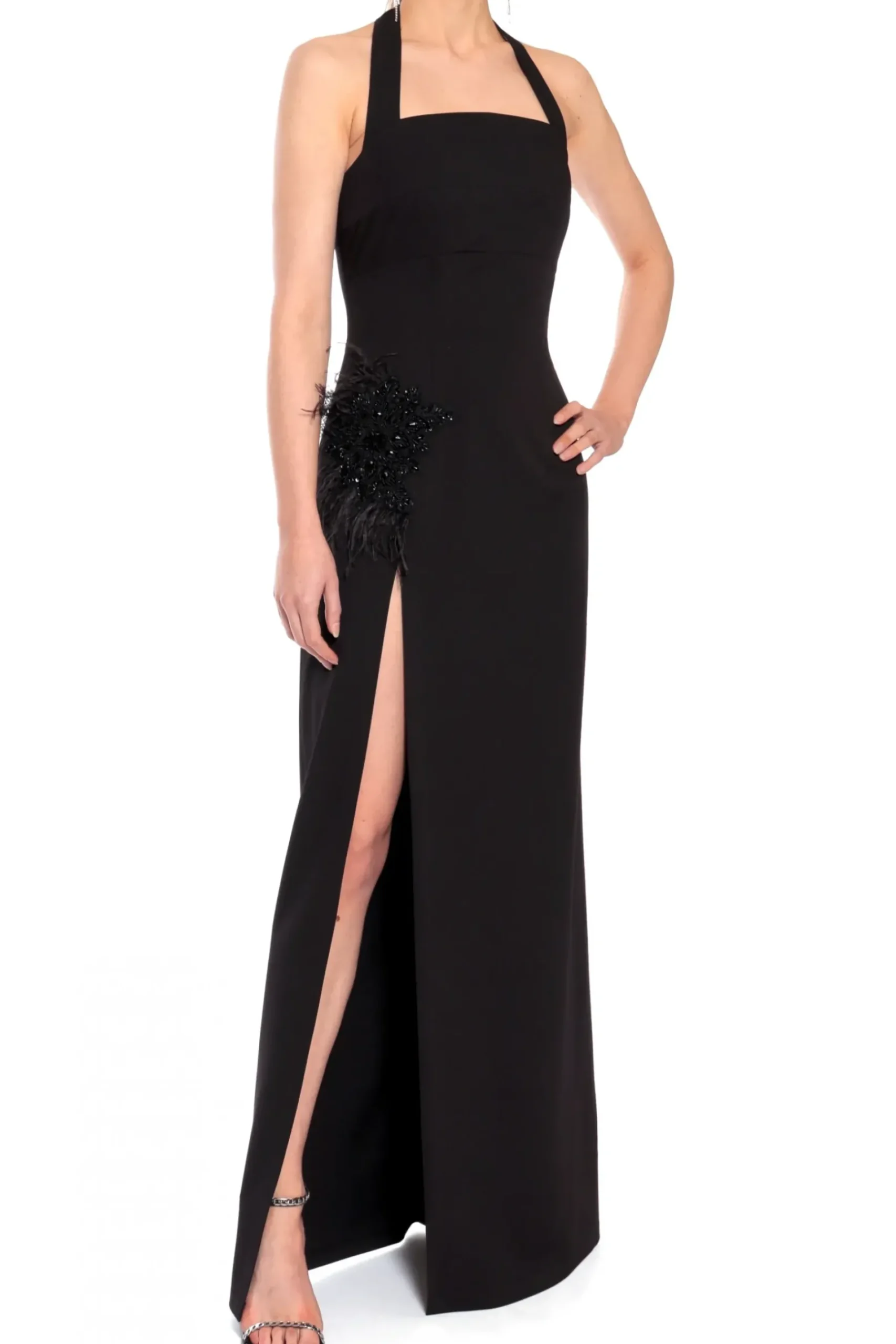 Wieczorowa Sukienka Maxi O Dopasowanym Kroju, Z Prostym Dekoltem Wspartym Na Ramiaczkach Laczacych Sie Na Karku. Zmyslowe Wyciecie Eksponujace Noge Zwienczone Efektowna Aplikacja – Kwiatem Wyszywanym Koralikami Oraz Piorami.