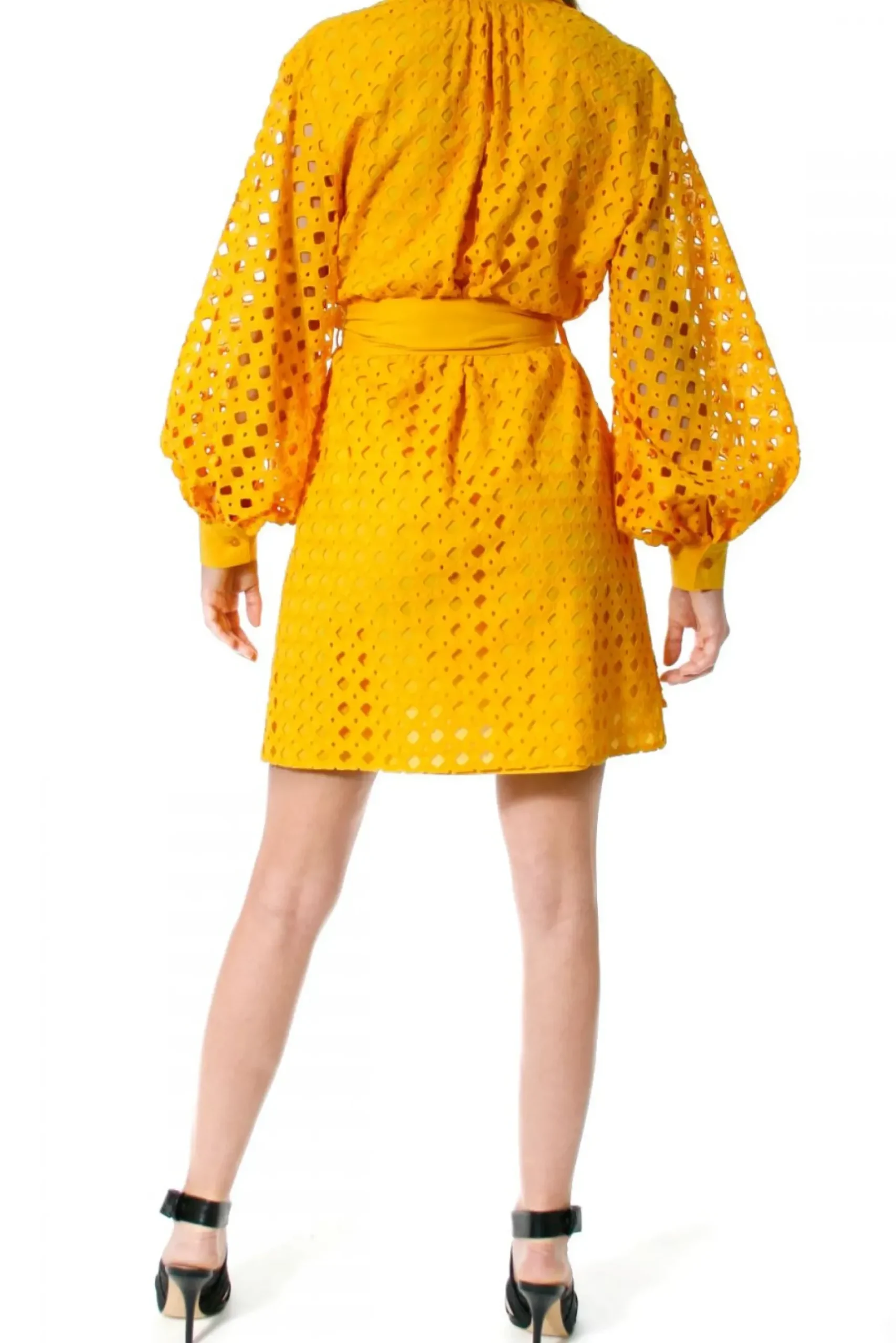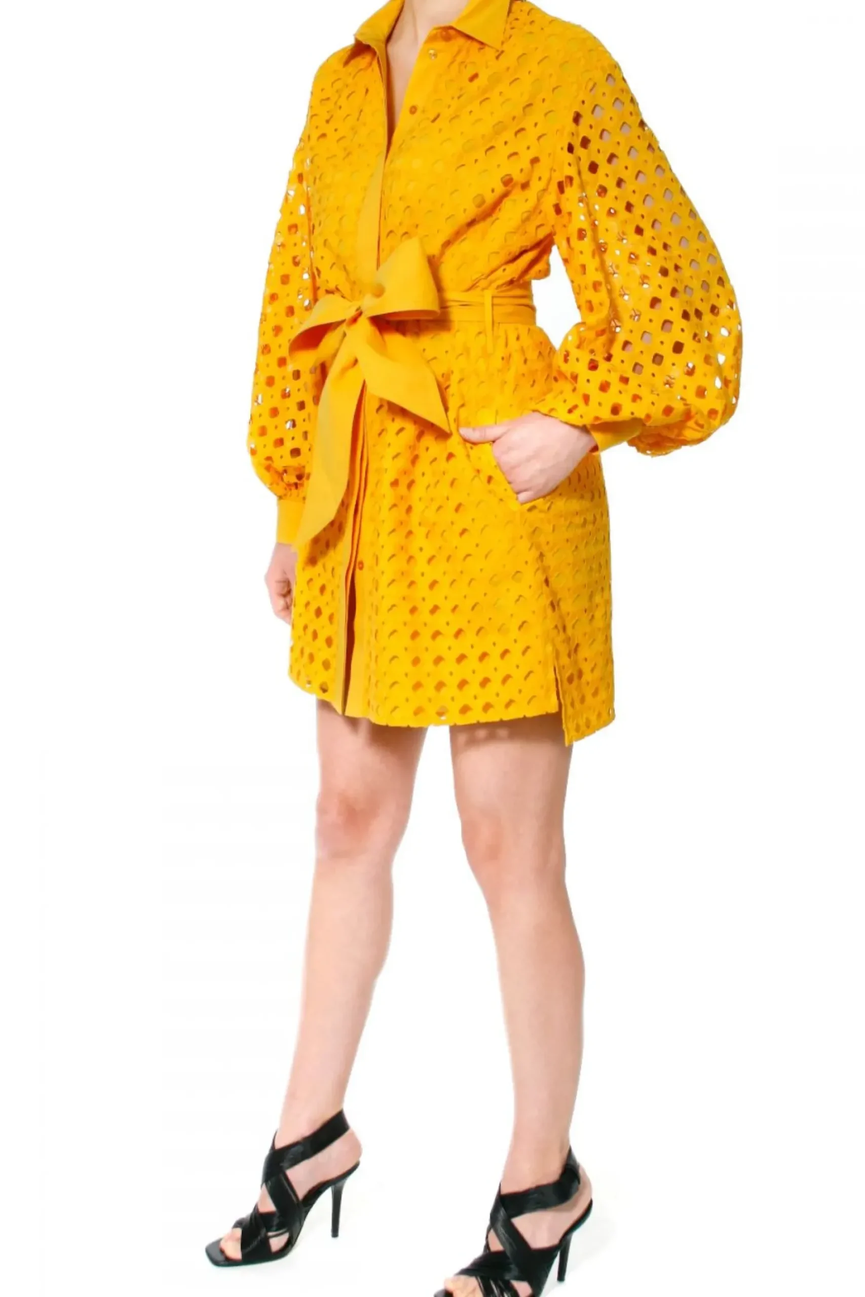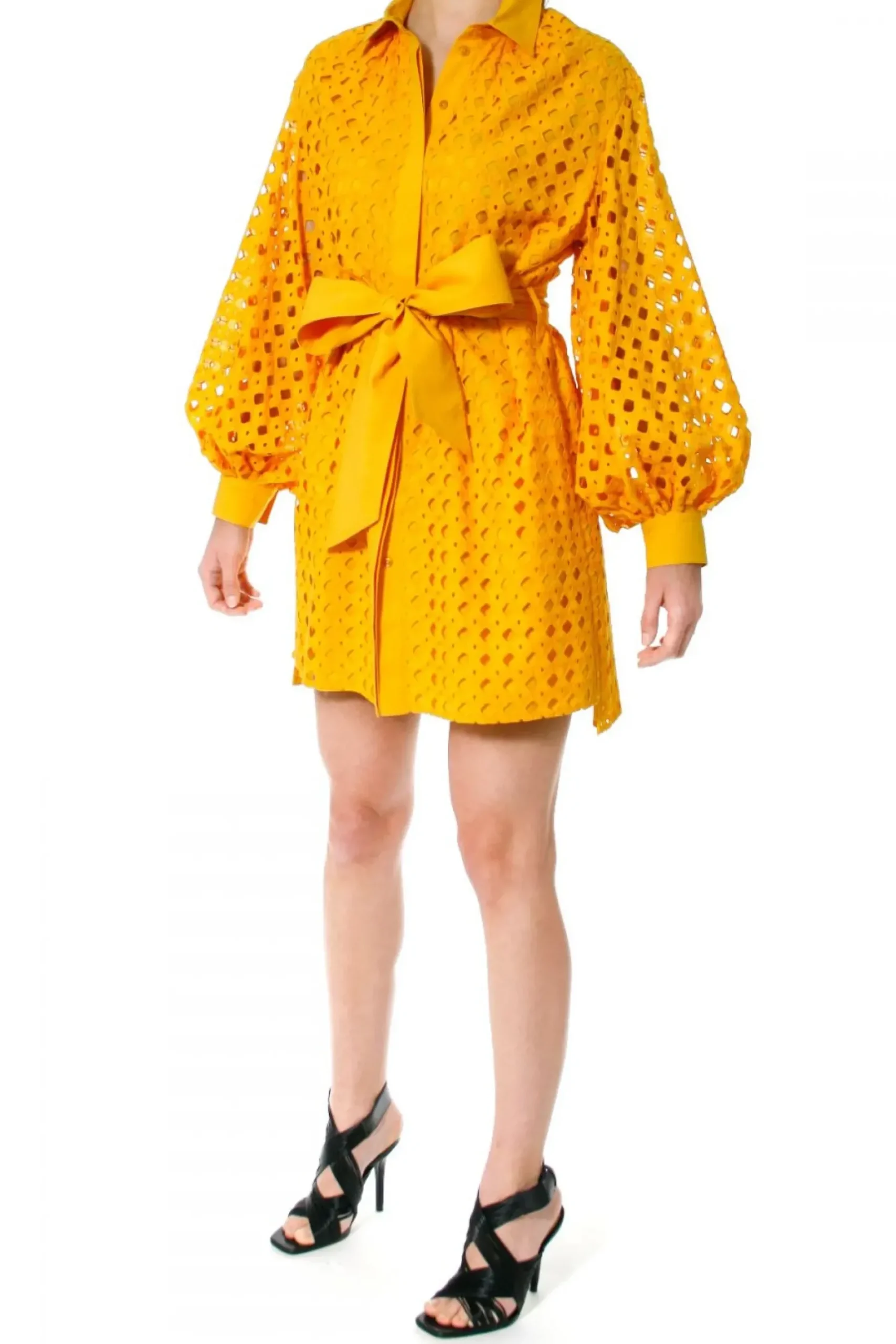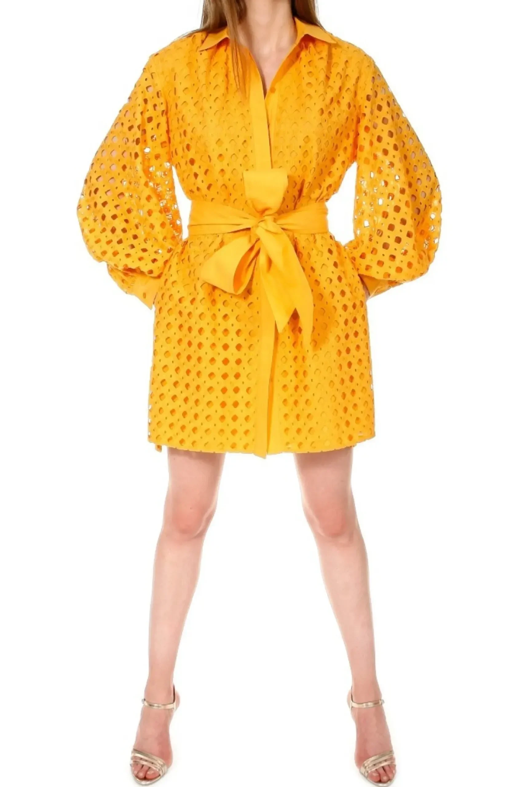 Sukienka O Kroju Luznej Koszuli Uszyta Z Haftowanej Bawelny. Dlugie, Przeswitujace Rekawy O Objetosci Xxl Bogato Marszczone Przy Mankietach. Maly, Ostro Zakonczony Kolnierzyk, Talia Przewiazywana Szerokim Paskiem Typu Szarfa, W Szwach Bocznych Ukryte Kieszenie.