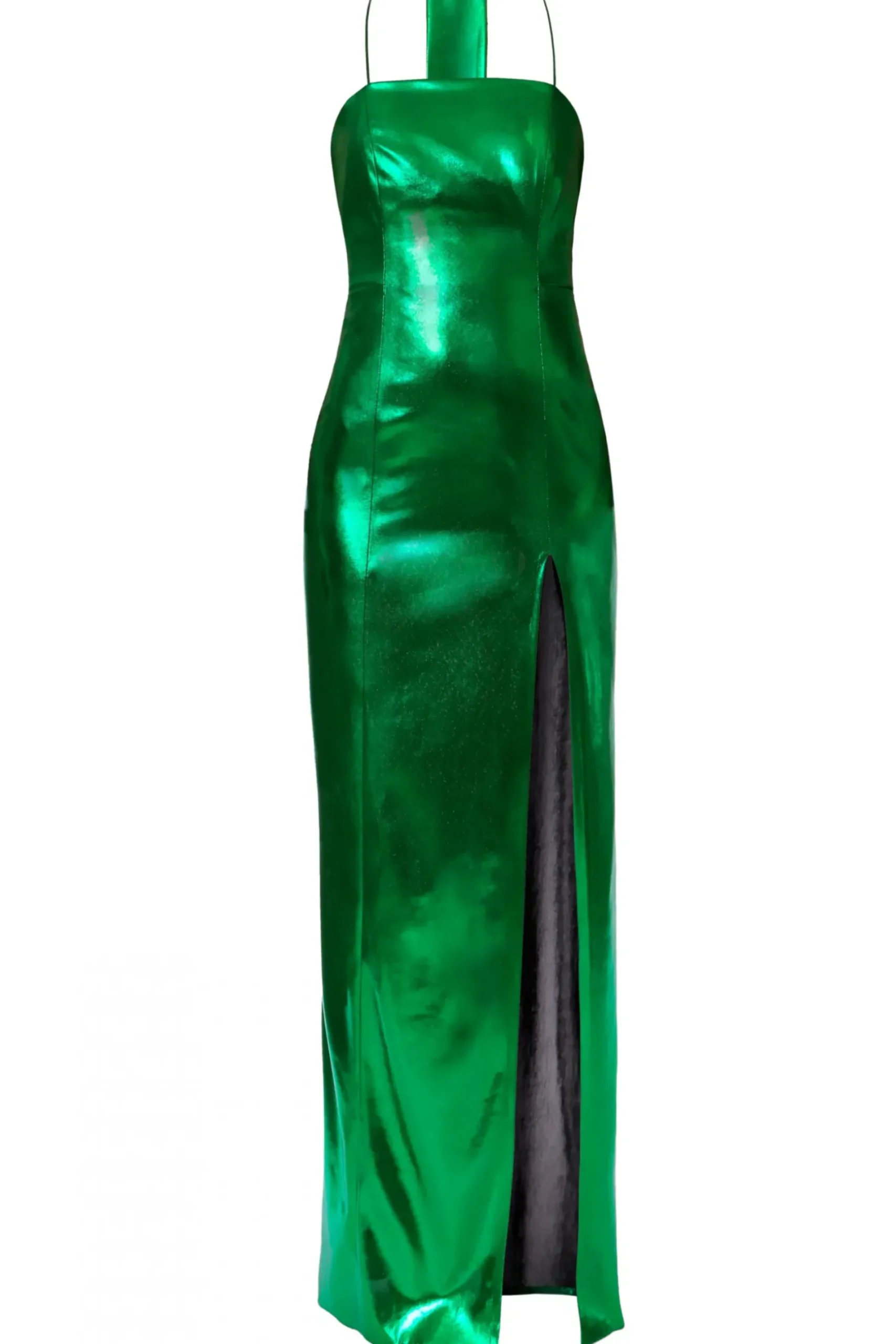 Wieczorowa Sukienka Wykonana Z Wyjatkowego Materialu Pokrytego Blyszczaca Apretura O Lejacym Efekcie. Lekko Elastyczne Wlasciwosci Materialu Zapewniaja Idealne Dopasowanie Do Sylwetki. Cienkie Ramiaczka Lacza Sie Z Tylu Prostokatnym Kawalkiem Materialu Oraz Poprzecznymi Paseczkami Tworzac Ciekawy, Przyciagajacy Wzrok Element Dekoracyjny. Sukienka Maxi Z Efektownym Rozcieciem Bedzie Idealna Kreacja Na Sylwestra Lub Zabawe Karnawalowa.