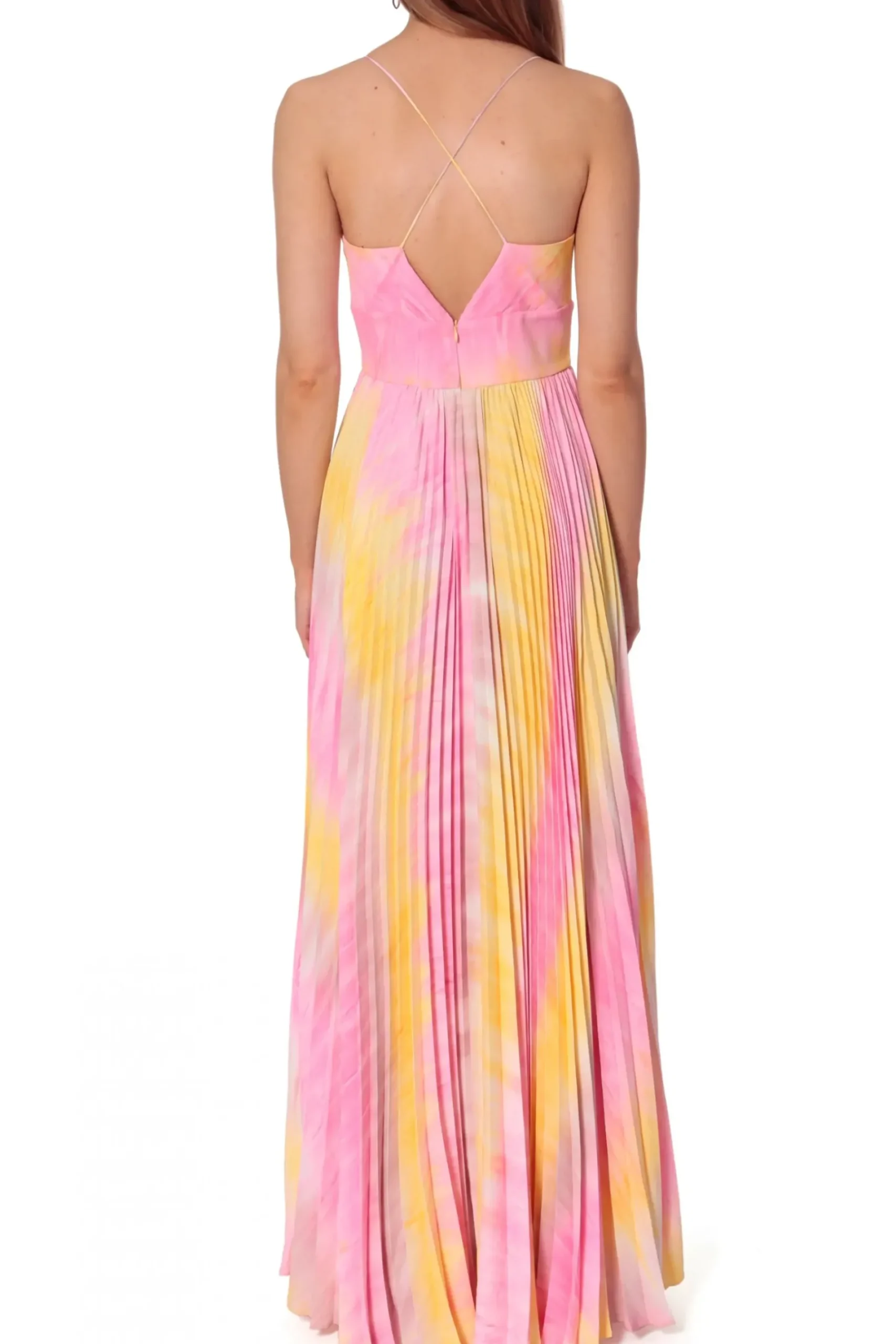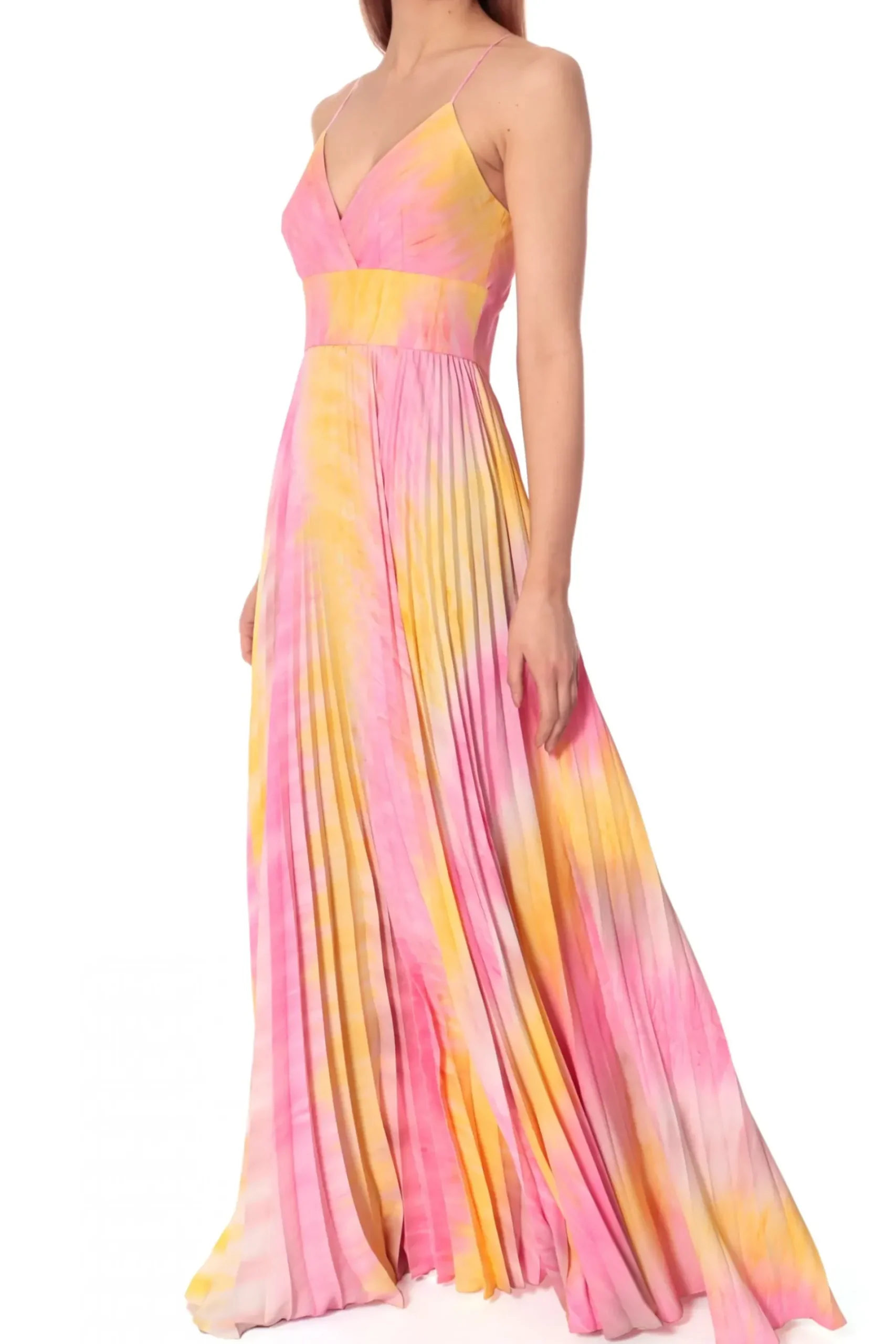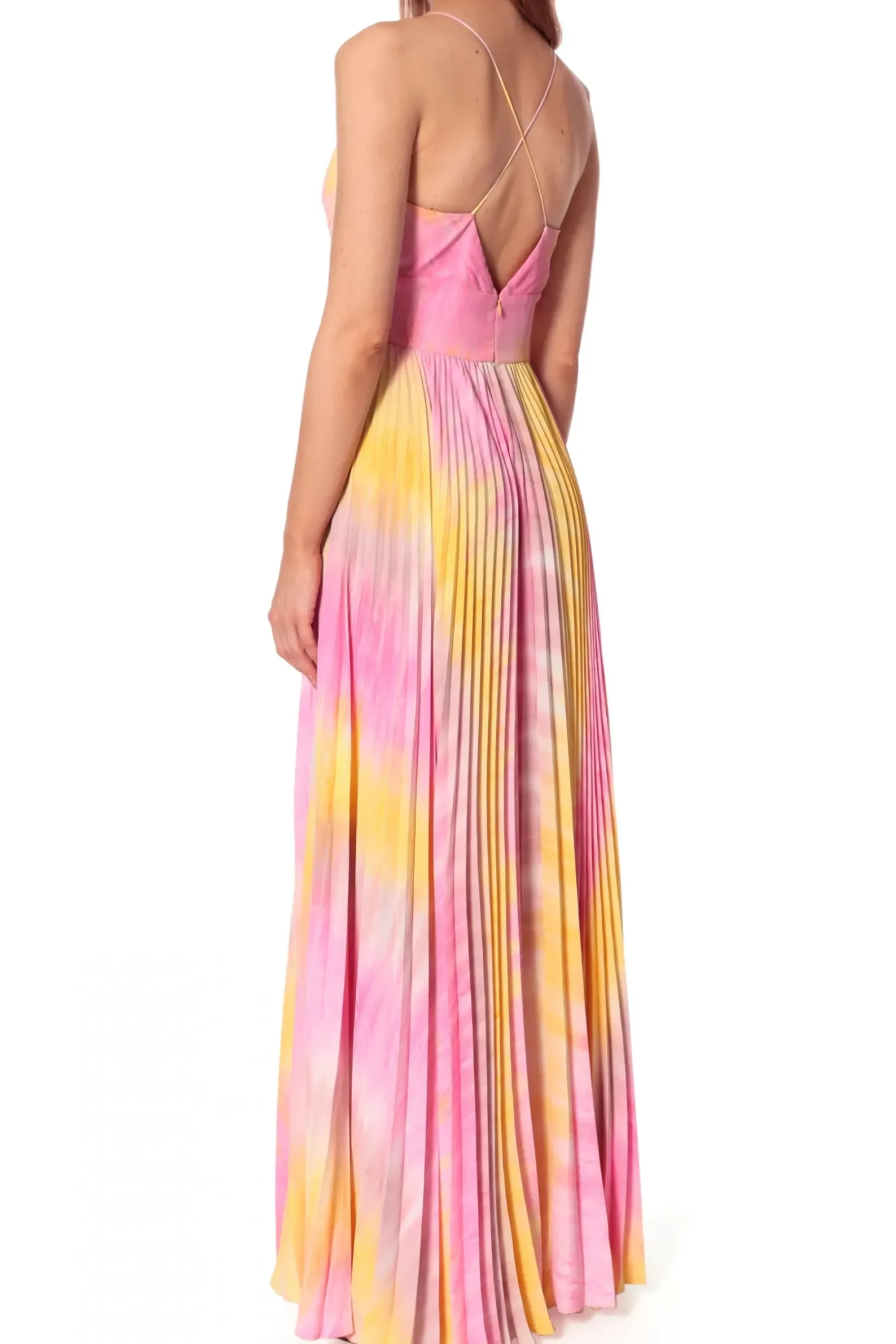 Zjawiskowa Sukienka Maxi Z Odkrytymi Plecami Uszyta Z Cienkiej Zwiewnej Tkaniny W Teczowy Desen. Wysoka Talia Podkreslona Szerokim Pasem. Bogaty, Efektowny Plisowany Dol Sukni Z Pelnego Kola Plastycznie I Lekko Kolysze Sie Podczas Ruchu Nadajac Lekkosci Sylwetce. Tyl Sukni Gleboko Wykrojony W Ksztalt Podkreslajacy Smuklosc Plecow. Dekolt W Szpic Z Cieniutkimi Ramiaczkami Typu Makaroniki Krzyzujacymi Sie Zmyslowo Pomiedzy Lopatkami, Z Tylu Zapinana Na Kryty Zamek Blyskawiczny.