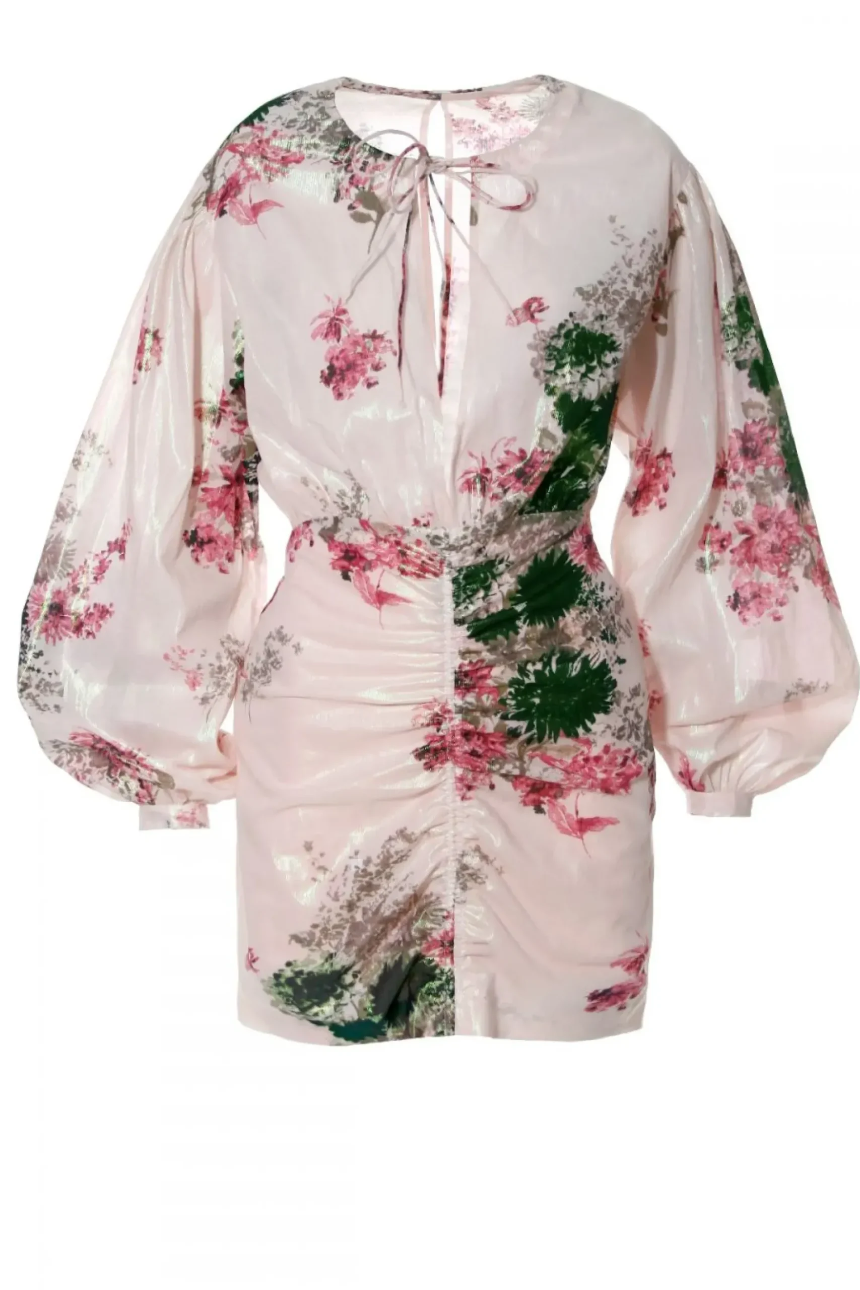 Sukienka Wykonana Z Delikatnego Batystu Z Dodatkiem Miekkiej Nici Metalicznej, Ktora Gesto Wpleciona Subtelnie Odbija Swiatlo I Nadaje Tkaninie Szlachetnego Perlowego Polysku. Okragly Dekolt Wiazany Na Dwa Regulowane Troczki-Makaroniki Pozwala Na Noszenie Na Dwa Sposoby – Wysoko Zawiazany Pod Szyja Lub Swobodnie, Pozwalajac Na Delikatne I Zmyslowe Rozchylanie Sie Waskiego Pekniecia Siegajacego Do Pasa. Obnizona Linia Ramion Z Przeskalowanymi, Obszernymi Rekawami Zebranymi W Waski Mankiet Przy Nadgarstku Co Tworzy Efektowna, Balonowa „Nadmuchana” Przestrzen. Lekko Luzniejsza Gora Sukienki Przymarszczona I Zebrana W Talii. Dol Sukienki O Dlugosci Mini Drapowany Z Przodu I Z Tylu Wspaniale Podkreslajacy Kobieca Linie Bioder I Posladki. Z Boku Zapinana Na Kryty Zamek Blyskawiczny, W Dolnej Czesci Na Podszewce.