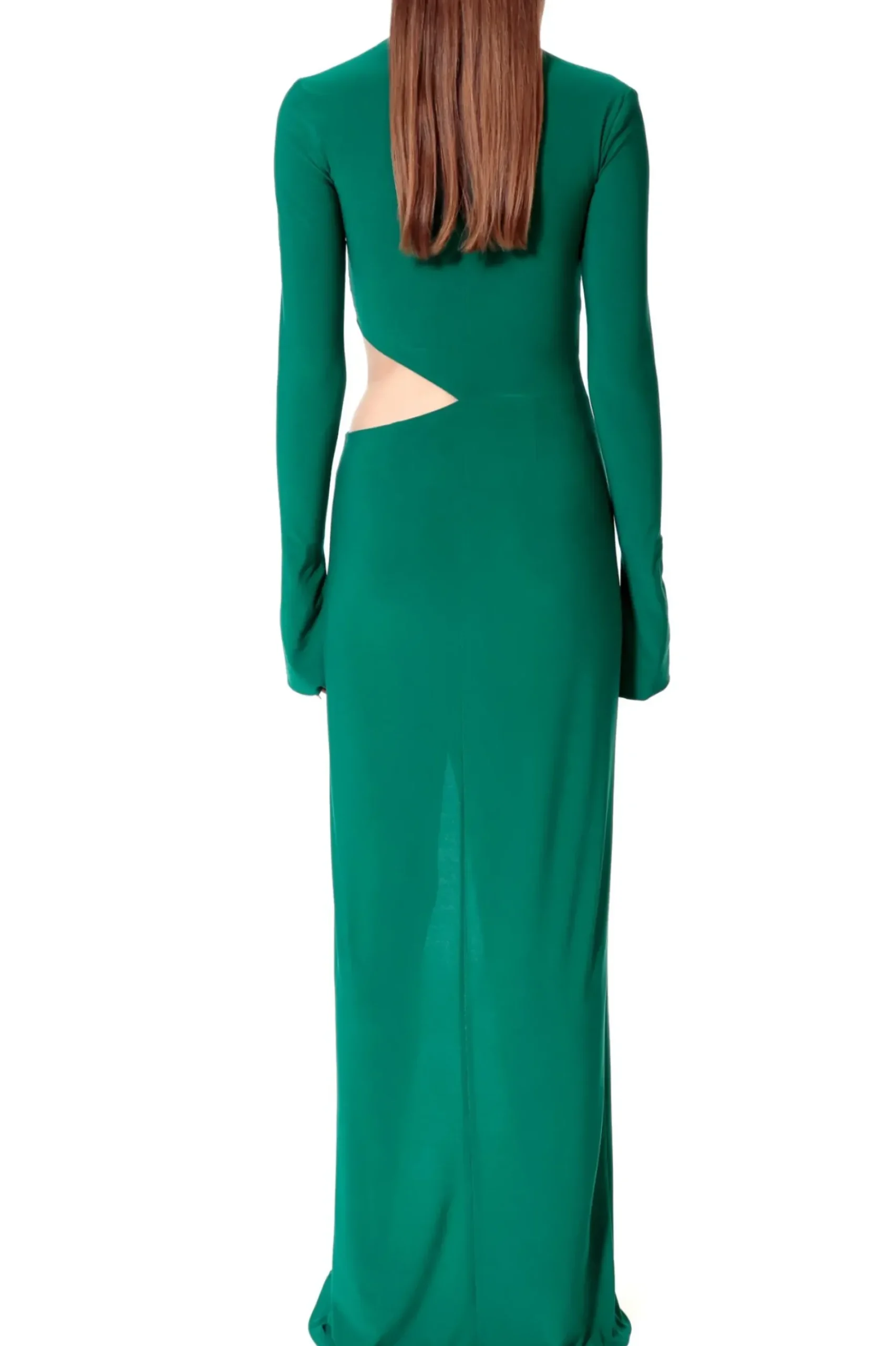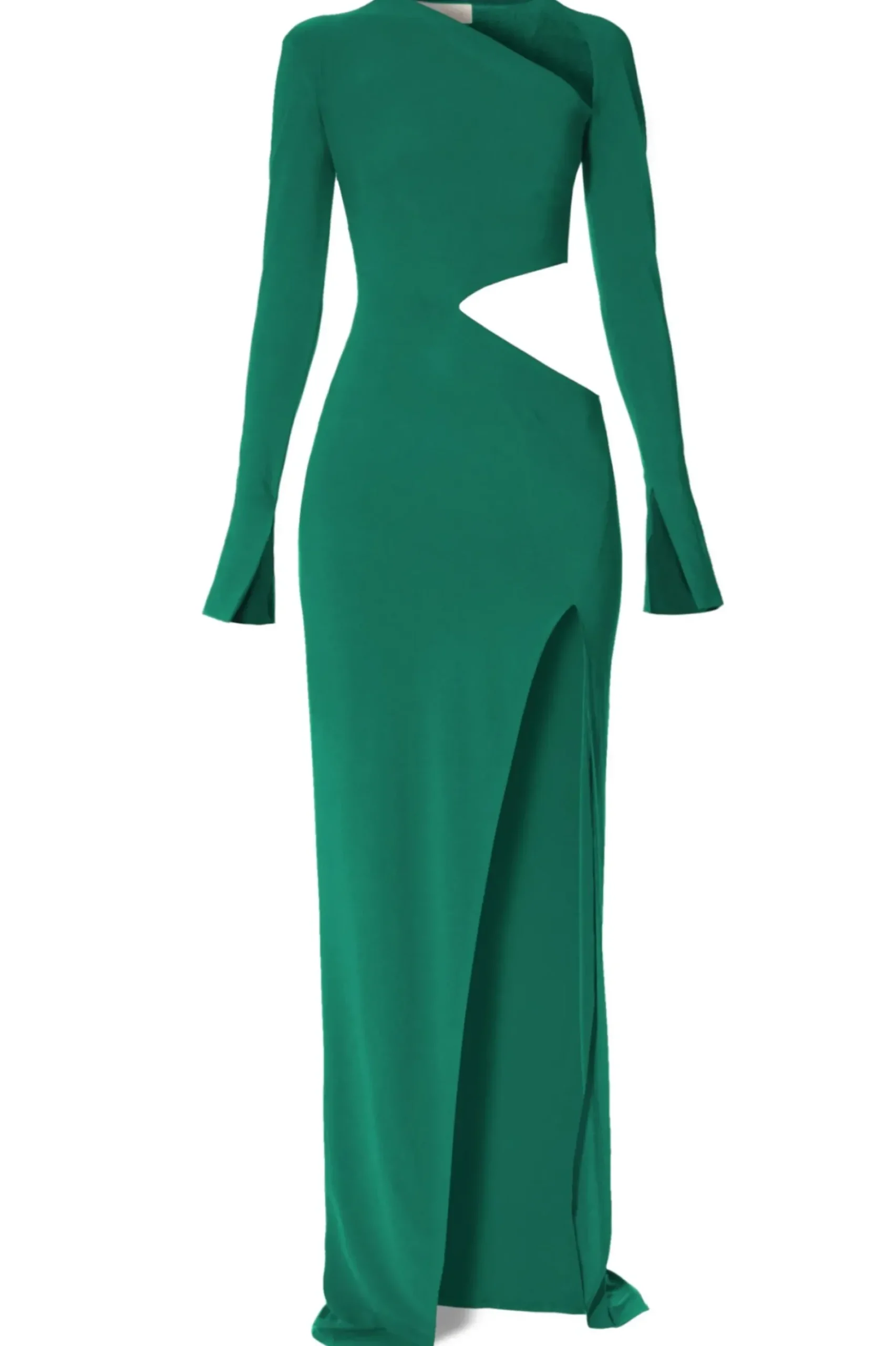 Suknia Maxi Z Asymetrycznym Dekoltem I Zmyslowym Wycieciem Odslaniajacym Talie. Uszyta Z Delikatnego, Lejacego I Jedwabistego W Dotyku Materialu Z Dodatkiem Elastanu W Kolorze Szmaragdowej Zieleni. Wysokie Rozciecie Na Lewym Udzie. Bardzo Dlugie Rekawy Z Peknieciami.