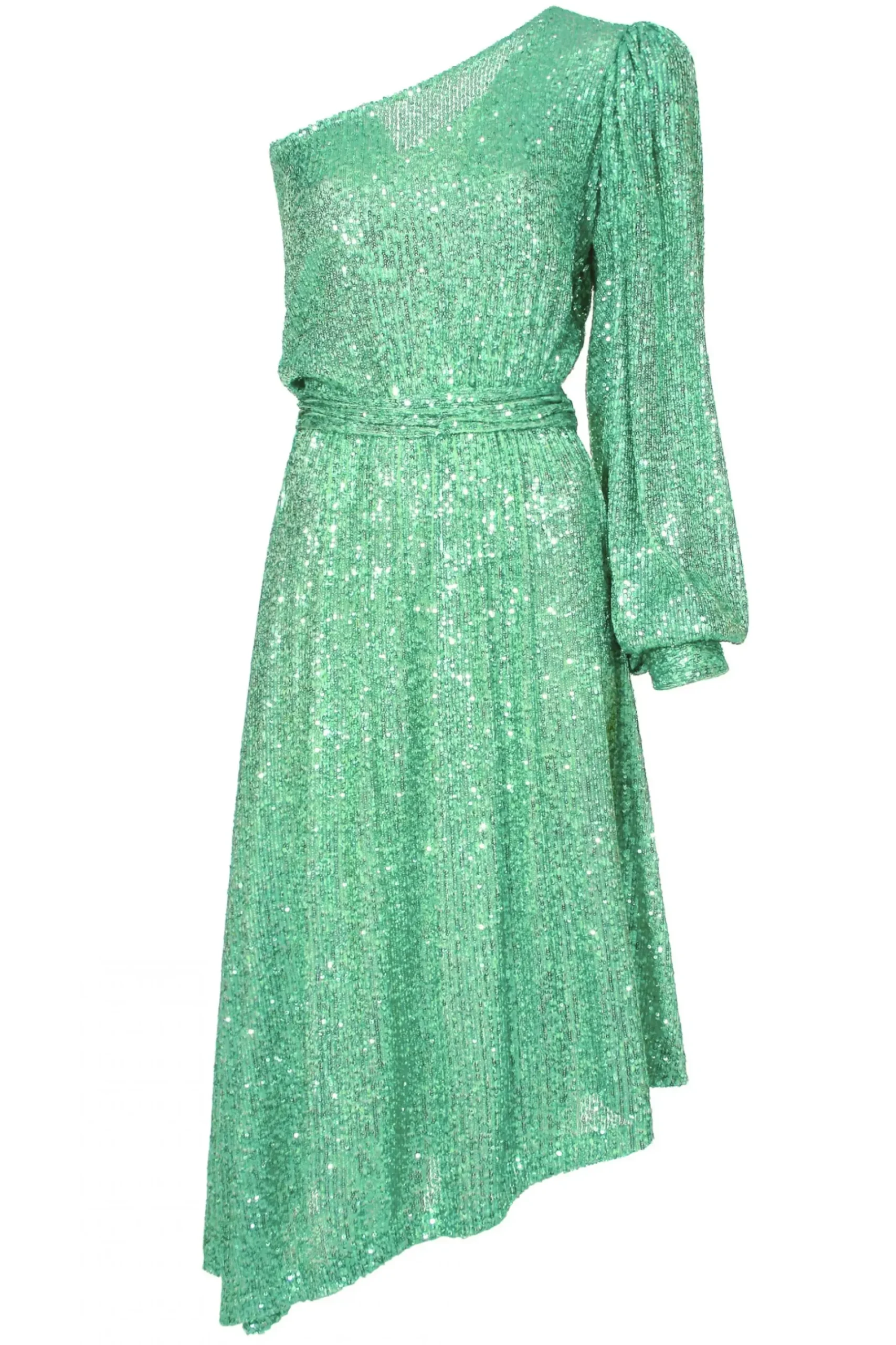 Koktajlowo-Wieczorowa Sukienka Midi Wyszywana Drobnymi, Polyskujacymi Cekinami. Projekt Z Mocno Zaakcentowana Asymetria – Dlugi, Obfity Rekaw Z Bufka I Dla Przeciwwagi Odsloniete Ramie. Talia Podkreslona Wszytym Drapowanym Paskiem. Trapezowy, Asymetryczny, Lekko Marszczony W Talii Dol Sukienki Oscylujacy W Granicach Dlugosci Midi Doskonale Dopelnia Proporcji Sylwetki I Wysmukla Ja. Zapinana Z Boku Na Zamek Blyskawiczny.