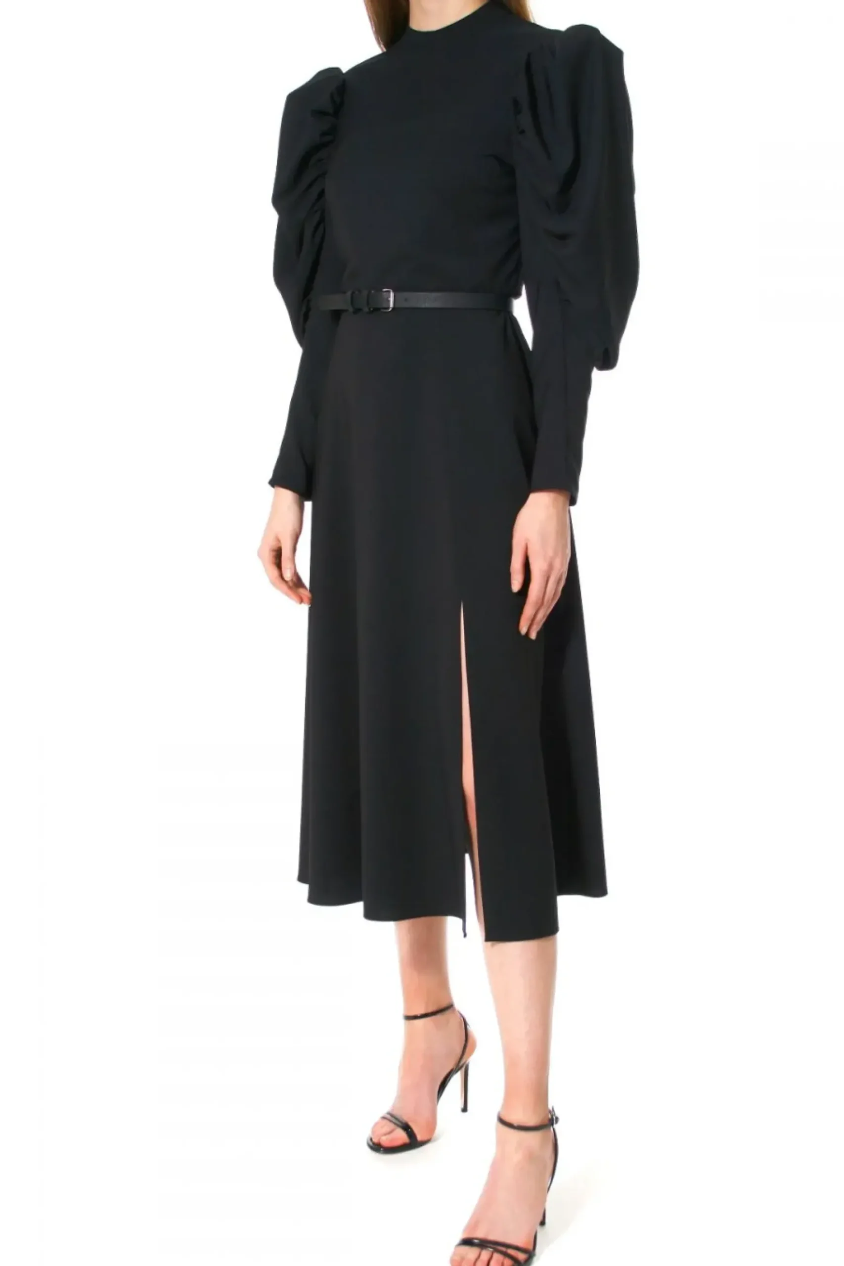 Sukienka Midi Uszyta Z Miesistej, Miekko Ukladajacej Sie Tkaniny O Sredniej Grubosci Z Dodatkiem Elastanu. Dekolt Ze Stojka. Obfite, Bufiaste Rekawy Z Wszytym Skrzydelkiem. Dol Sukienki Z Klinow, Rozszerzany Z Rozcieciem Na Lewej Nodze. Sukienka Idealna Na Codzien, Do Pracy A Takze Na Impreze I Przyjecie. Sukienka Z Bufkami.