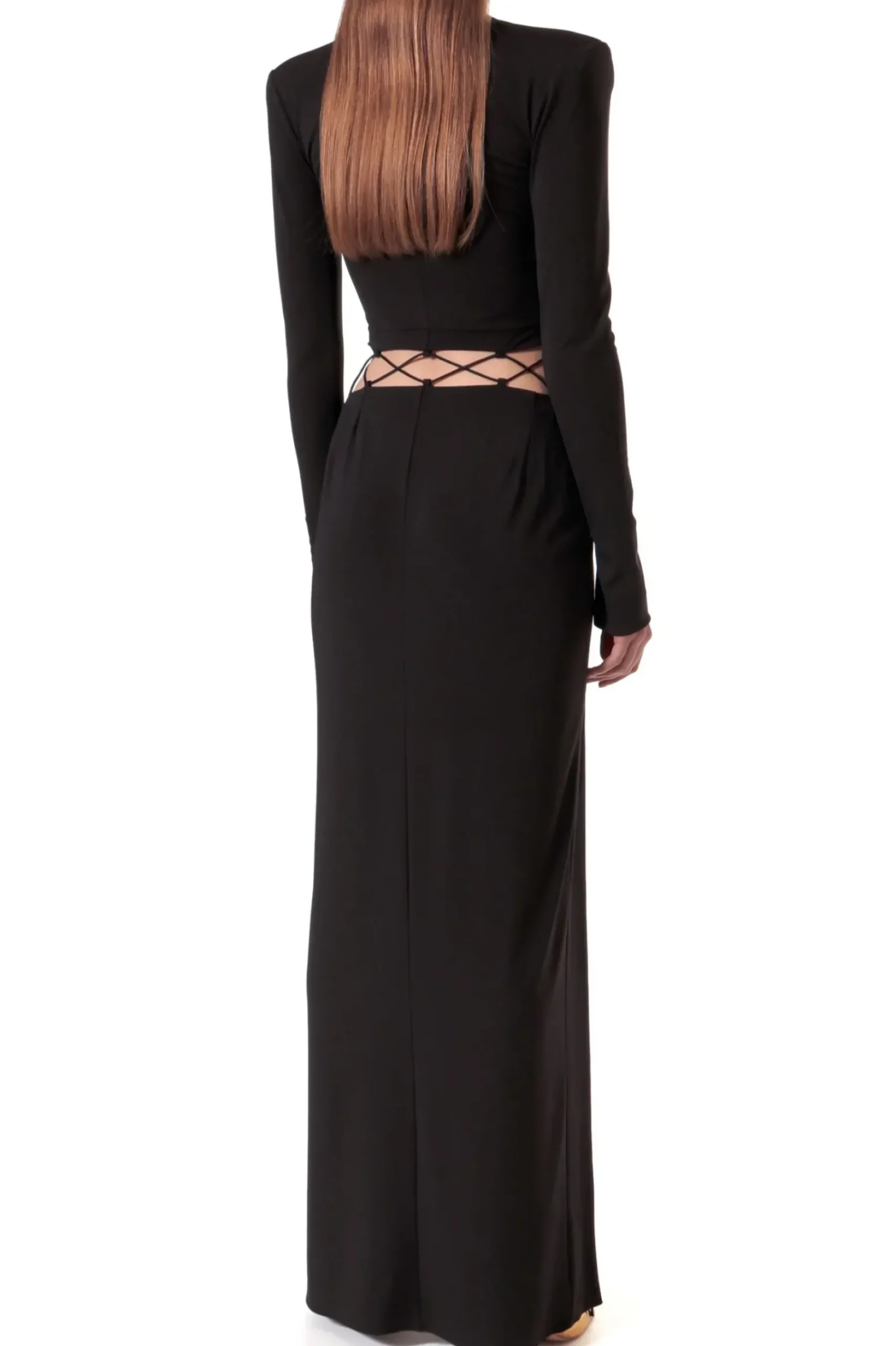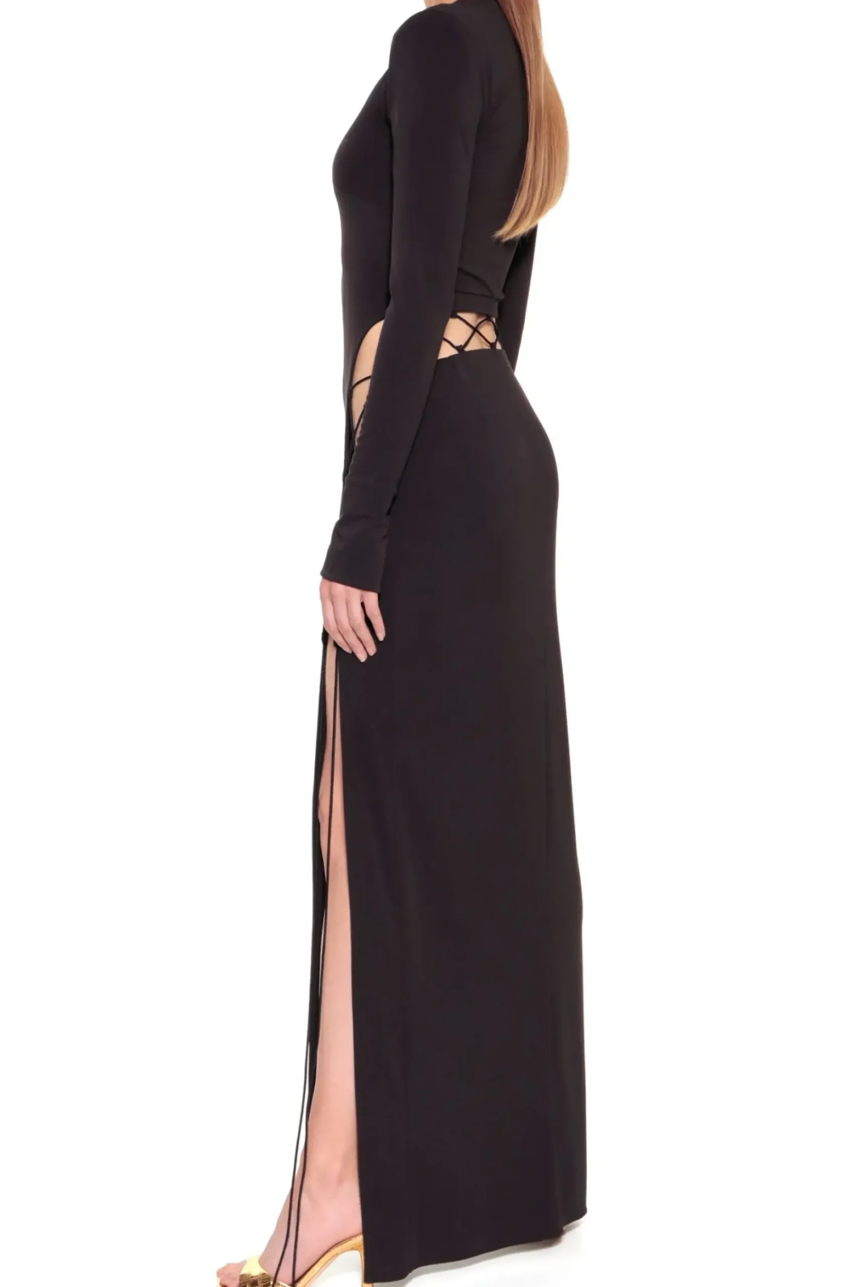 Suknia Maxi Xena Black Of Night Ze Zmyslowymi Sznurowanymi Wycieciami Na Udach I Wokol Bioder.Gleboki, Geometrycznie Zarysowany Dekolt. Zdecydowana Linia Ramion Podkreslona Malymi Poduszkami.