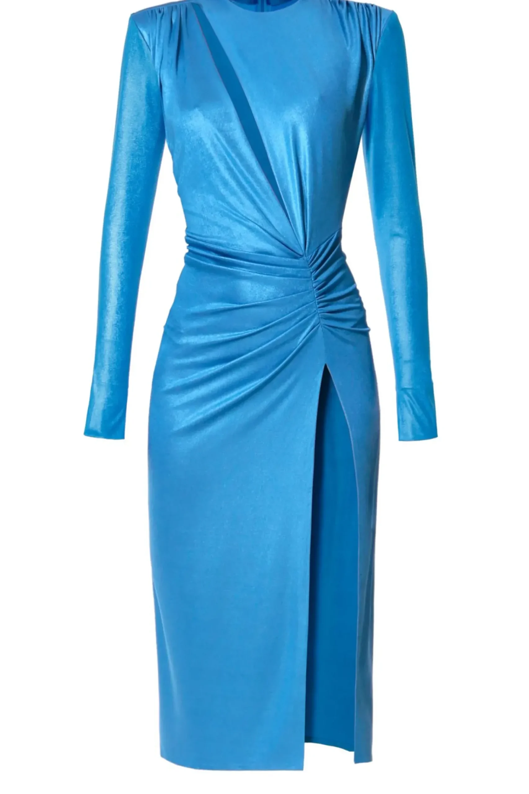 Suknia Midi Uszyta Z Elastycznego, Miekko Podkreslajacego Sylwetke Materialu O Jedwabistym Chwycie I Subtelnym Perlowym Polysku. Zabudowana Linia Dekoltu, Dlugie Smukle Rekawy, Dlugosc Midi Artystycznie Wydobywa Sensualnosc Kobiecej Sylwetki Zdecydowanym, Ukosnym Rozcieciem Miedzy Piersiami Oraz Ekscytujaco Eksponujacym Noge. Drapowania Zalamuja Swiatlo Podkreslajac Kunszt Precyzyjnej Pracy Wykonanej W Naszej Pracowni. Ramiona Zaakcentowane Poduszkami. Zapinana Na Kryty Zamek Blyskawiczny.