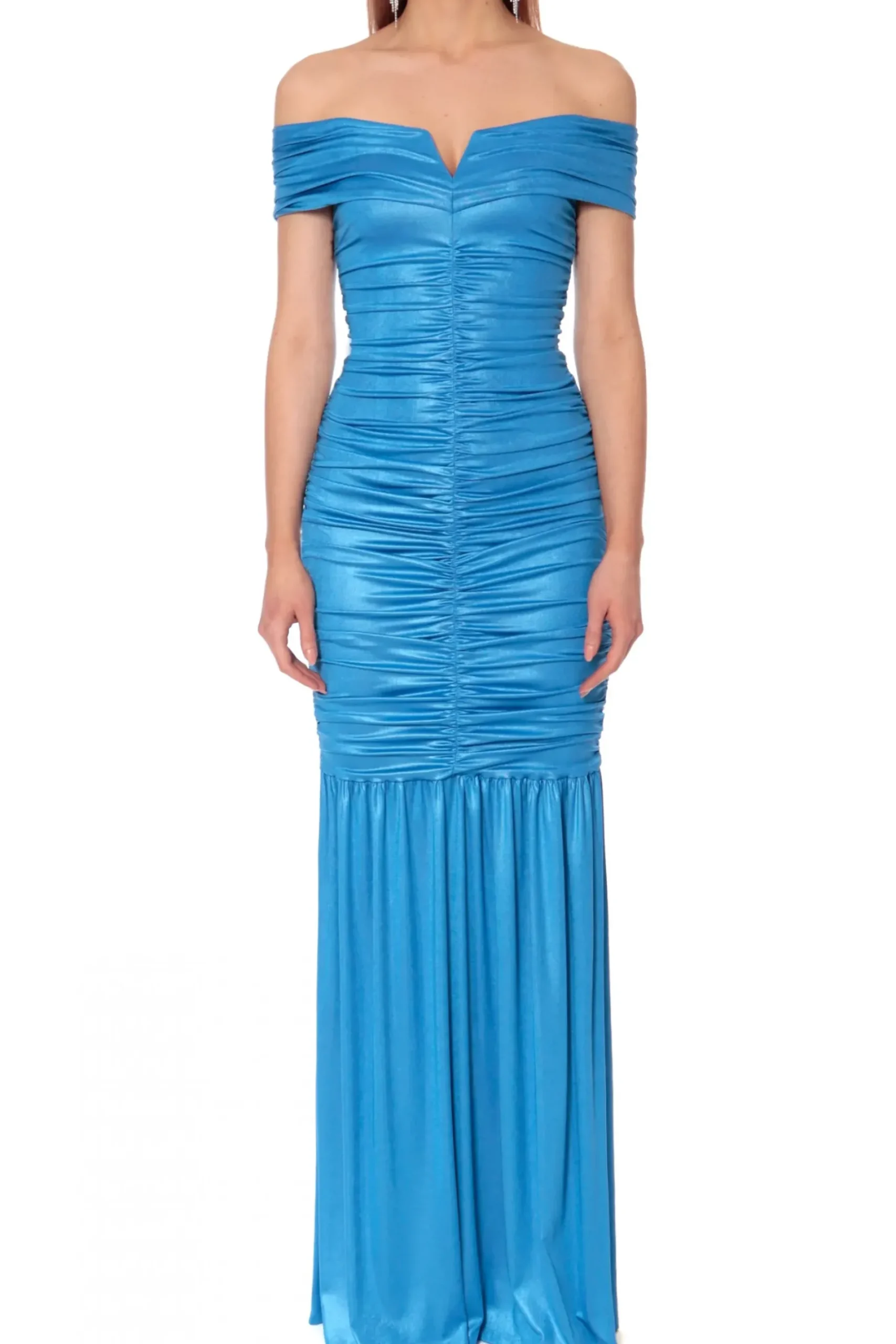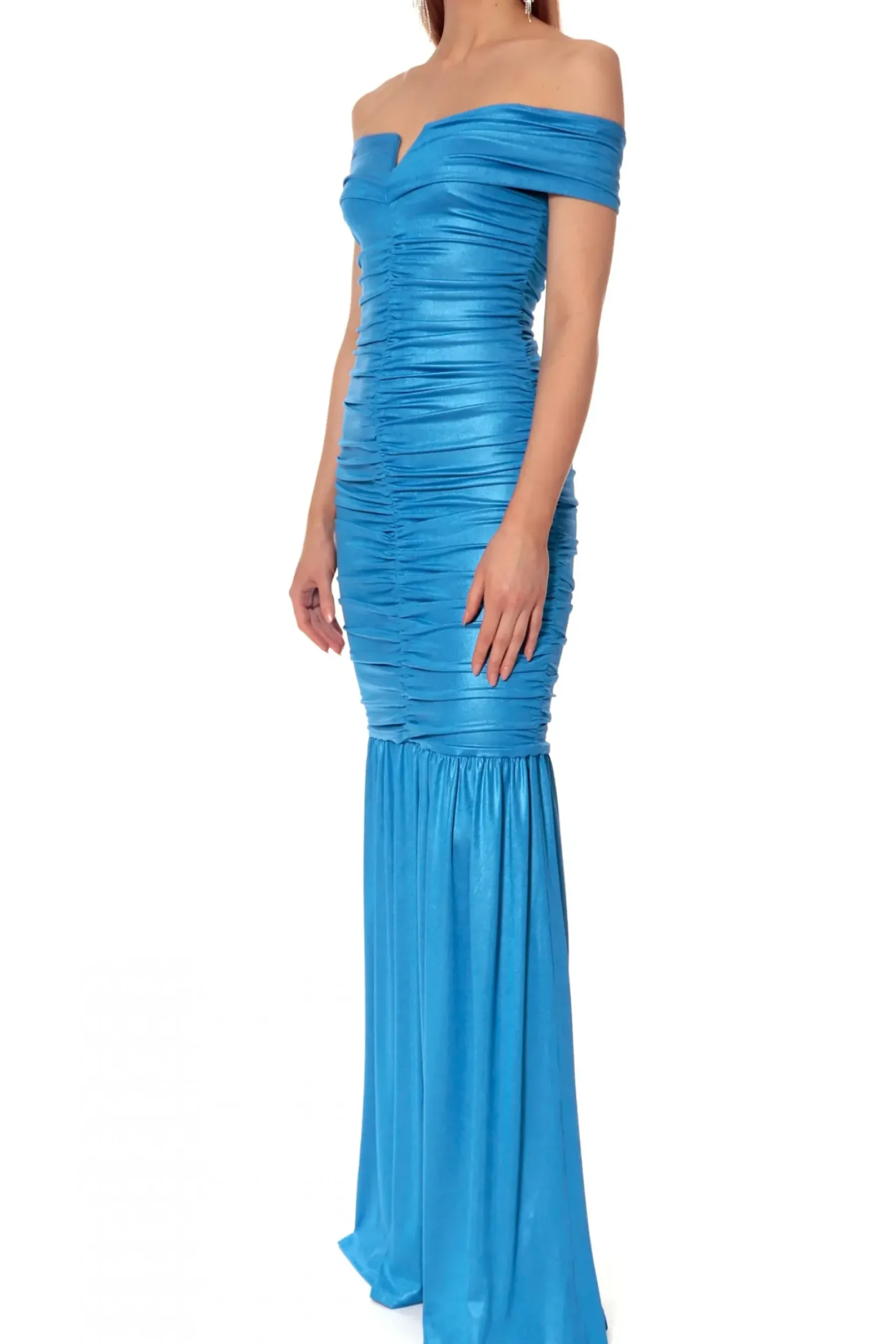 Sukienka Maxi Uszyta Z Elastycznego Materialu O Jedwabistym Chwycie I Subtelnym Perlowym Polysku. Mocno Odsloniety Dekolt Wraz Z Ramionami, Drapowania Otulajace Talie Wraz Z Obficie Marszczona Falbana Idealnie Podkreslaja Kobiece Ksztalty.