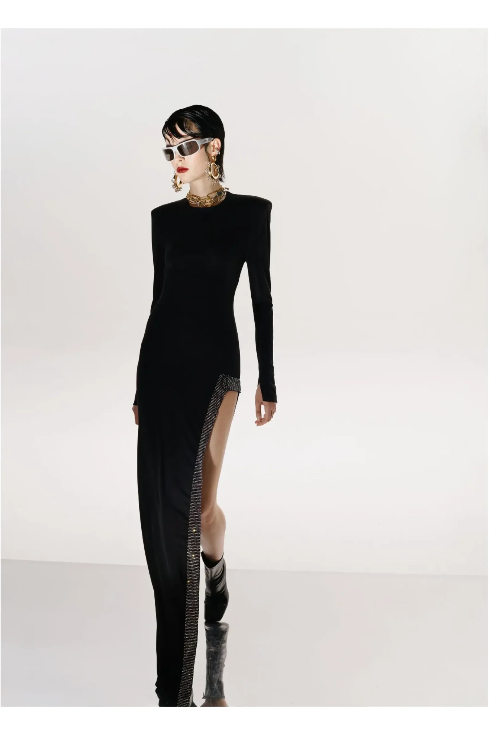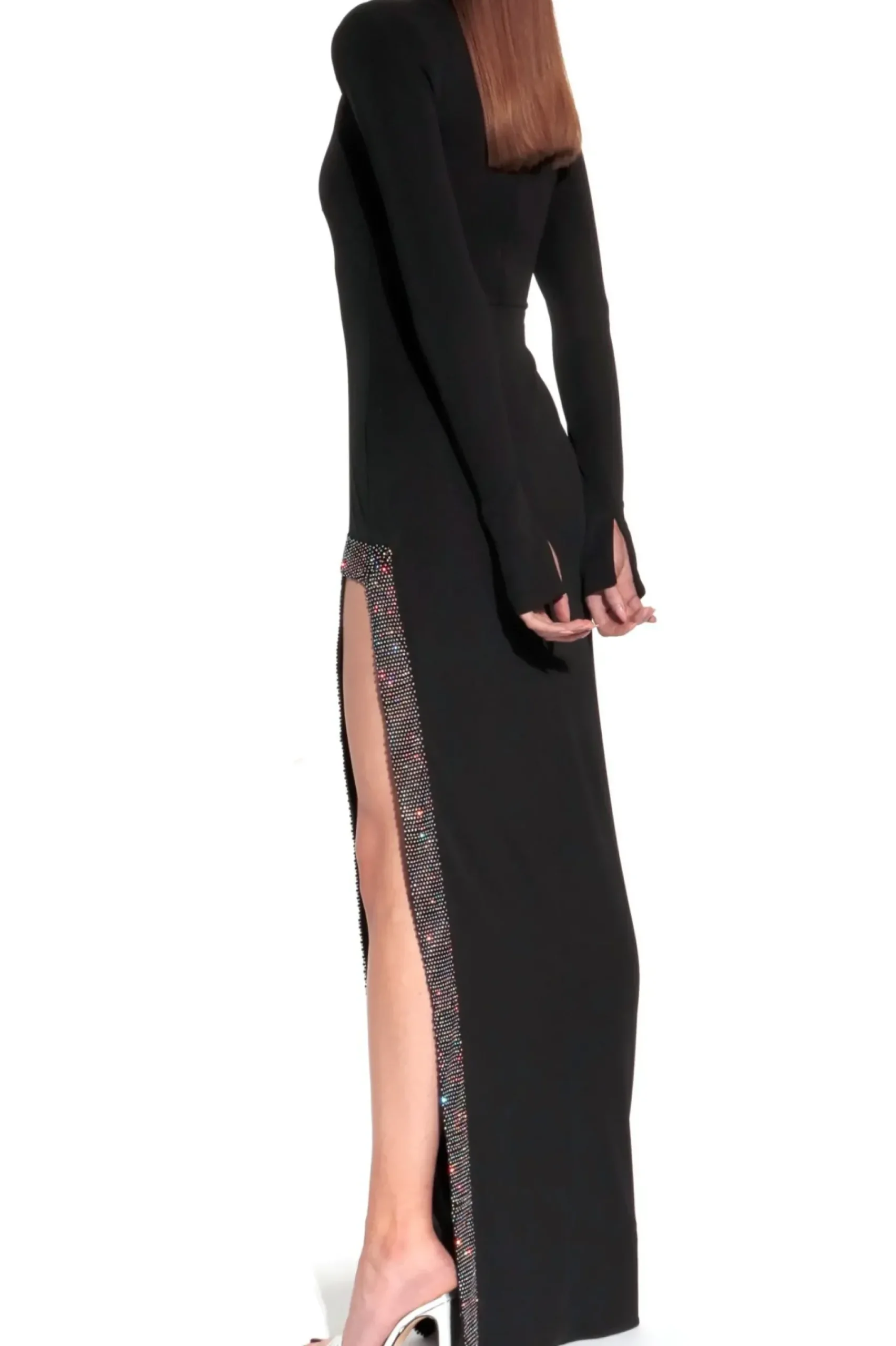 Odwazne I Zmyslowe Wyciecie Eksponujace Noge Ozdobione Efektownymi, Drobnymi Krysztalkami Odbijajacymi Swiatlo.